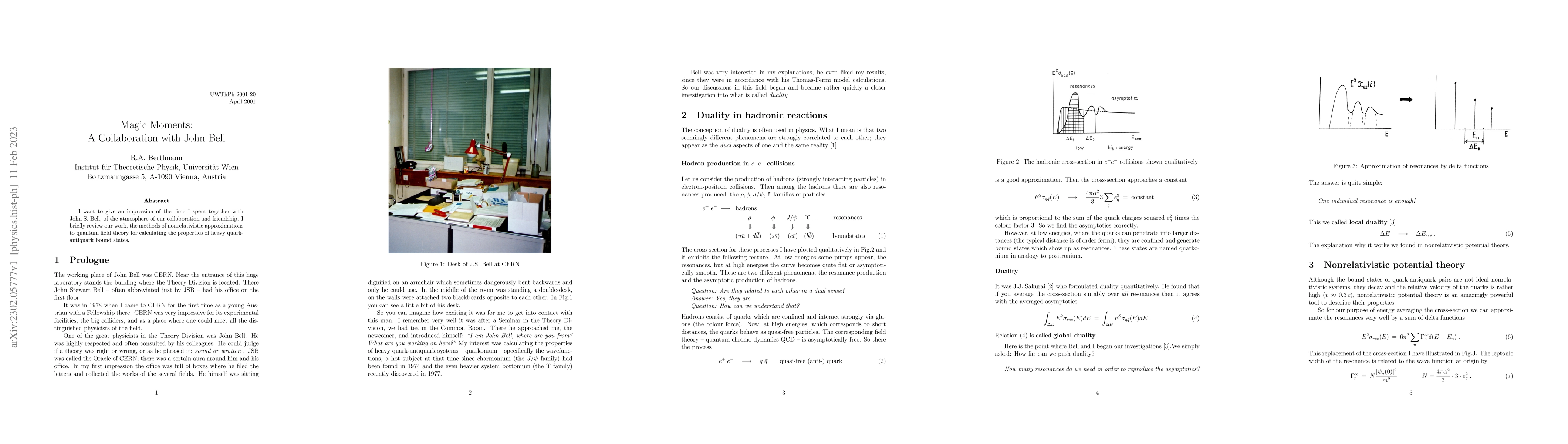 I want to give an impression of the time I spent together with John S. Bell, of the atmosphere of our collaboration and friendship. I briefly review our work, the methods of nonrelativistic approximations to quantum field theory for calculating the properties of heavy quark-antiquark bound states.