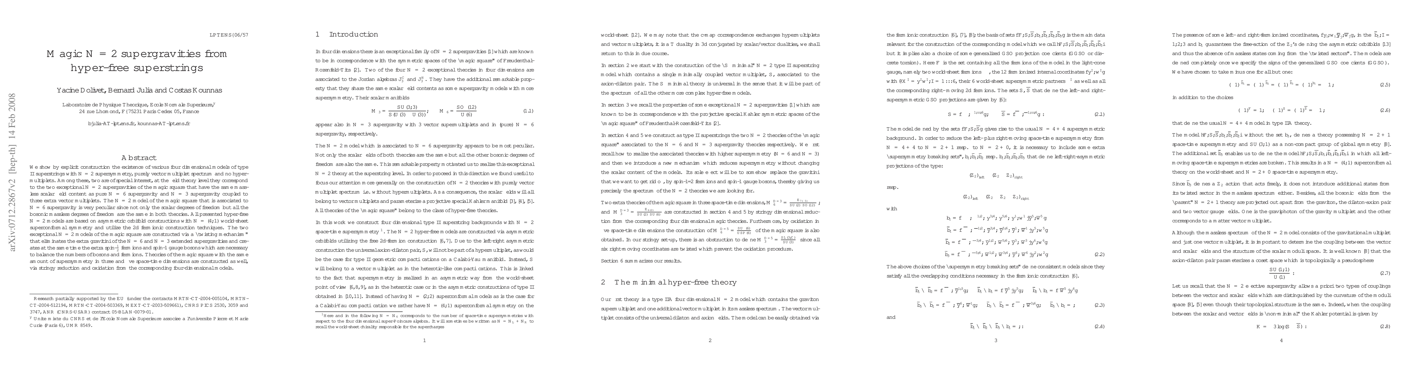 We show by explicit construction the existence of various four dimensional models of type II superstrings with N=2 supersymmetry, purely vector multiplet spectrum and no hypermultiplets. Among these, two are of special interest, at the field theory level they correspond to the two exceptional N=2 supergravities of the magic square that have the same massless scalar field content as pure N=6 supergravity and N=3 supergravity coupled to three extra vector multiplets. The N=2 model of the magic square that is associated to N=6 supergravity is very peculiar since not only the scalar degrees of freedom but all the bosonic massless degrees of freedom are the same in both theories. All presented hyper-free N=2 models are based on asymmetric orbifold constructions with N=(4,1) world-sheet superconformal symmetry and utilize the 2d fermionic construction techniques. The two exceptional N=2 models of the magic square are constructed via a "twisting mechanism" that eliminates the extra gravitini of the N=6 and N=3 extended supergravities and creates at the same time the extra spin-1/2 fermions and spin-1 gauge bosons which are necessary to balance the numbers of bosons and fermions. Theories of the magic square with the same amount of supersymmetry in three and five space-time dimensions are constructed as well, via stringy reduction and oxidation from the corresponding four-dimensional models.