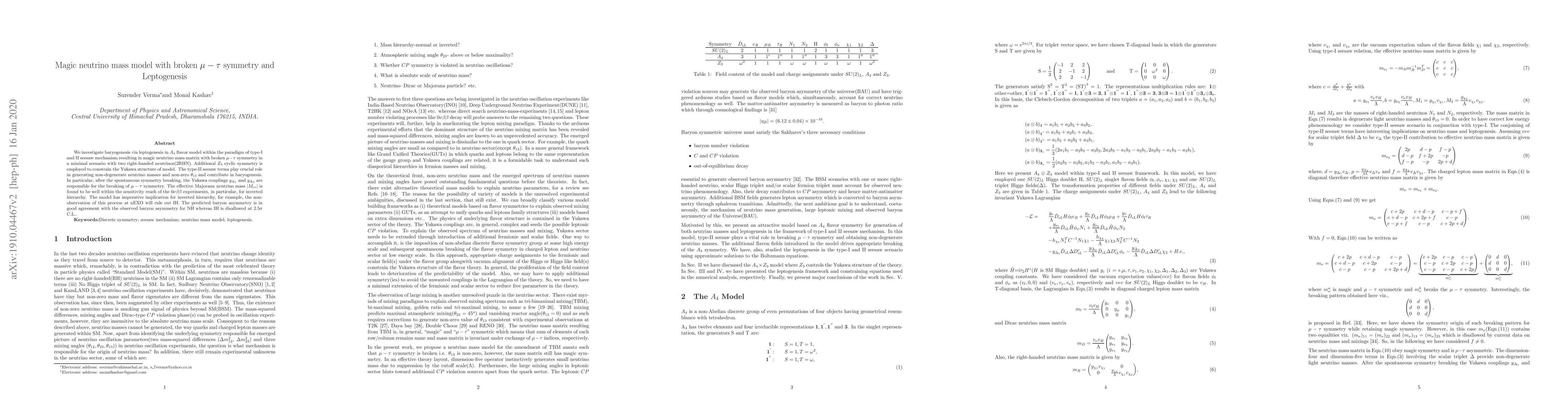 This research paper explores a model for magic neutrino mass with broken mu-tau symmetry and leptogenesis, predicting baryon asymmetry in good agreement with observations for normal hierarchy but disallowed for inverted hierarchy.