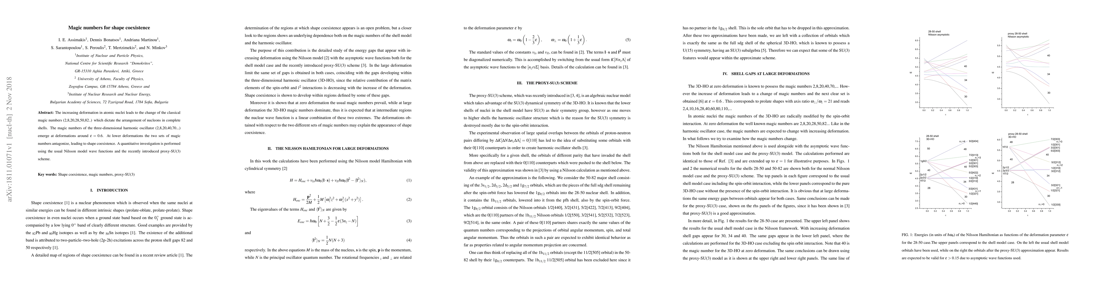 Research finds that at lower deformations in atomic nuclei, magic numbers from different models (Nilsson and proxy-SU(3)) conflict, leading to coexistence of two distinct shapes. This phenomenon occurs around deformation epsilon=0.6.