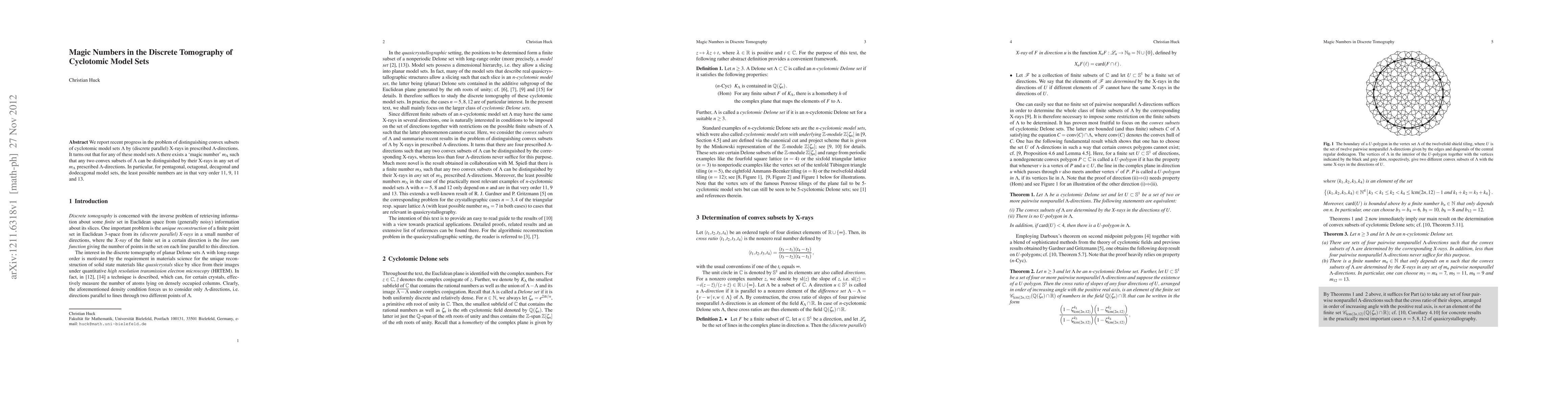 We report recent progress in the problem of distinguishing convex subsets of cyclotomic model sets $\varLambda$ by (discrete parallel) X-rays in prescribed $\varLambda$-directions. It turns out that for any of these model sets $\varLambda$ there exists a `magic number' $m_{\varLambda}$ such that any two convex subsets of $\varLambda$ can be distinguished by their X-rays in any set of $m_{\varLambda}$ prescribed $\varLambda$-directions. In particular, for pentagonal, octagonal, decagonal and dodecagonal model sets, the least possible numbers are in that very order 11, 9, 11 and 13.