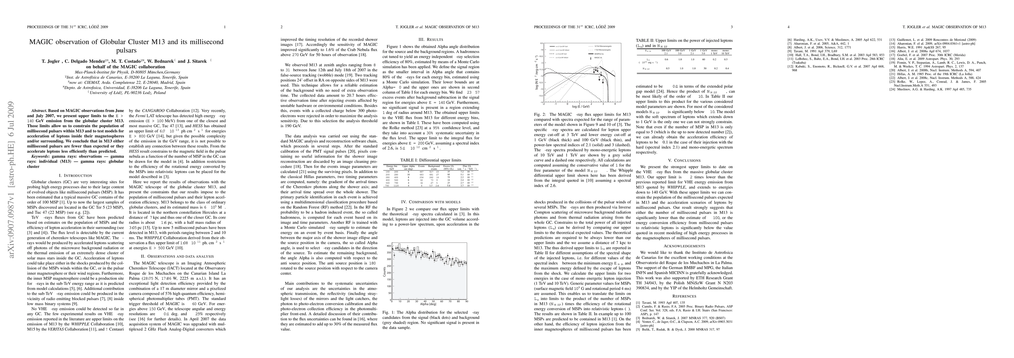 Summary: MAGIC observations of globular cluster M13 in 2007 set upper limits on high-energy gamma emission, suggesting either fewer millisecond pulsars than anticipated or less efficient lepton acceleration in their magnetospheres compared to models.