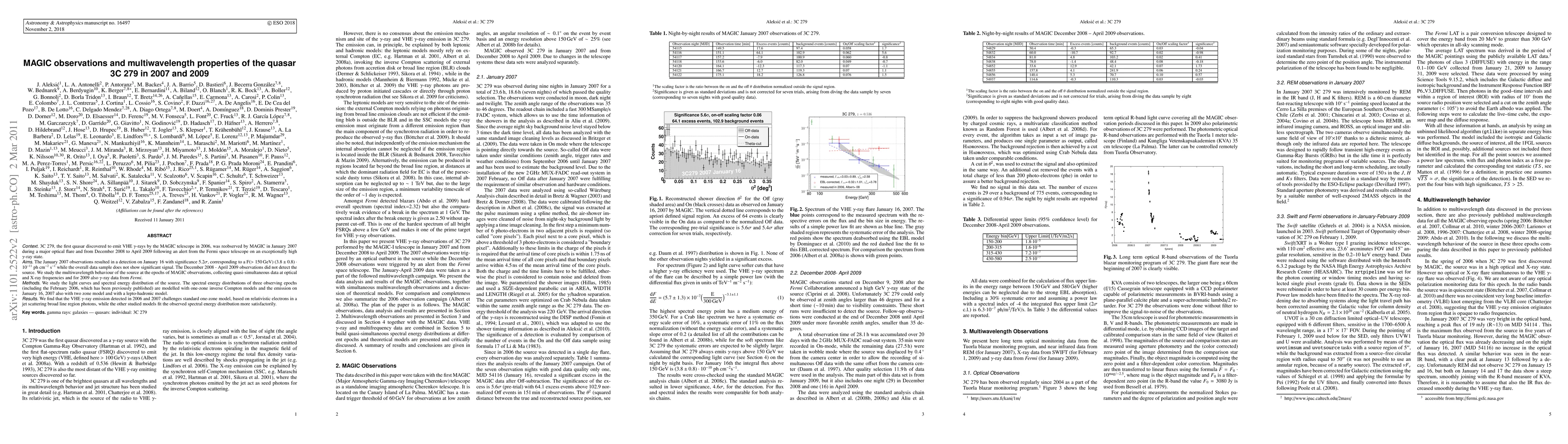 Context. 3C 279, the first quasar discovered to emit VHE gamma-rays by the MAGIC telescope in 2006, was reobserved by MAGIC in January 2007 during a major optical flare and from December 2008 to April 2009 following an alert from the Fermi space telescope on an exceptionally high gamma -ray state. Aims. The January 2007 observations resulted in a detection on January 16 with significance 5.2 sigma, corresponding to a F(> 150 GeV) (3.8 \pm 0.8) \cdot 10^-11 ph cm^-2 s^-1 while the overall data sample does not show significant signal. The December 2008 - April 2009 observations did not detect the source. We study the multiwavelength behavior of the source at the epochs of MAGIC observations, collecting quasi-simultaneous data at optical and X-ray frequencies and for 2009 also gamma-ray data from Fermi. Methods. We study the light curves and spectral energy distribution of the source. The spectral energy distributions of three observing epochs (including the February 2006, which has been previously published in Albert et al. 2008a) are modeled with one-zone inverse Compton models and the emission on January 16, 2007 also with two zone model and with a lepto-hadronic model. Results. We find that the VHE gamma-ray emission detected in 2006 and 2007 challenges standard one-zone model, based on relativistic electrons in a jet scattering broad line region photons, while the other studied models fit the observed spectral energy distribution more satisfactorily.