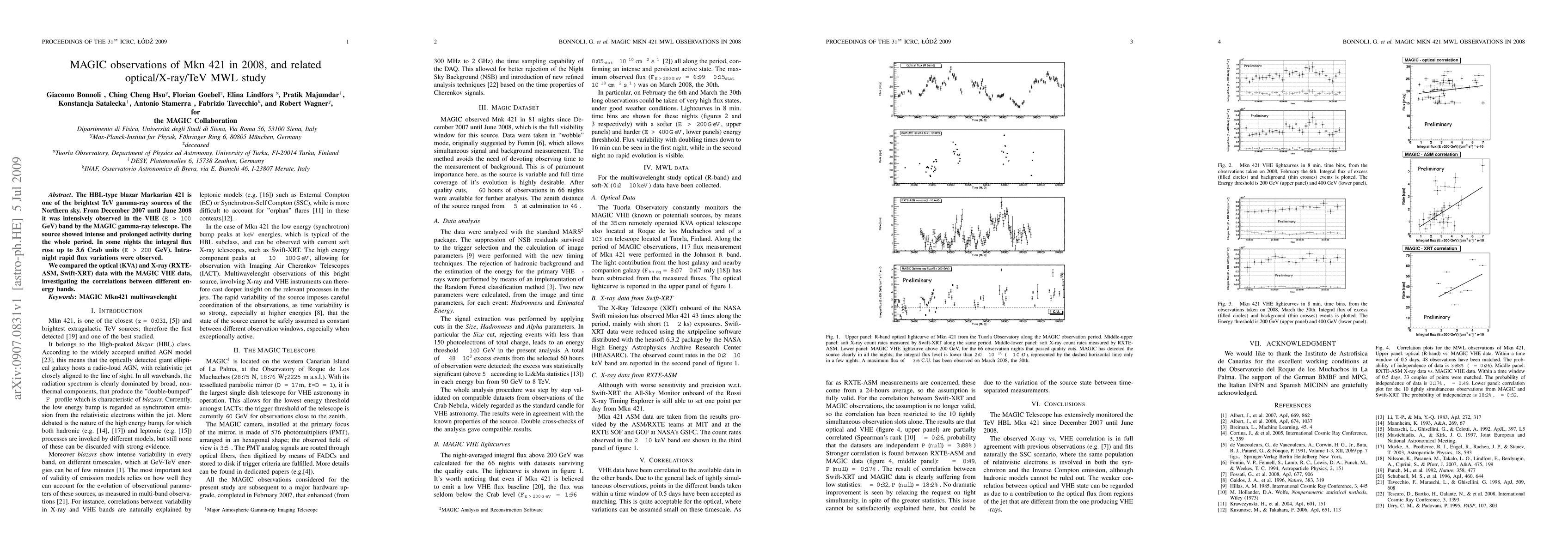 The HBL-type blazar Markarian 421 is one of the brightest TeV gamma-ray sources of the Northern sky. From December 2007 until June 2008 it was intensively observed in the VHE (E>100 GeV) band by the MAGIC gamma-ray telescope. The source showed intense and prolonged activity during the whole period. In some nights the integral flux rose up to 3.6 Crab units (E>200 GeV). Intra-night rapid flux variations were observed. We compared the optical (KVA) and X-ray (RXTE-ASM, Swift-XRT) data with the MAGIC VHE data, investigating the correlations between different energy bands.