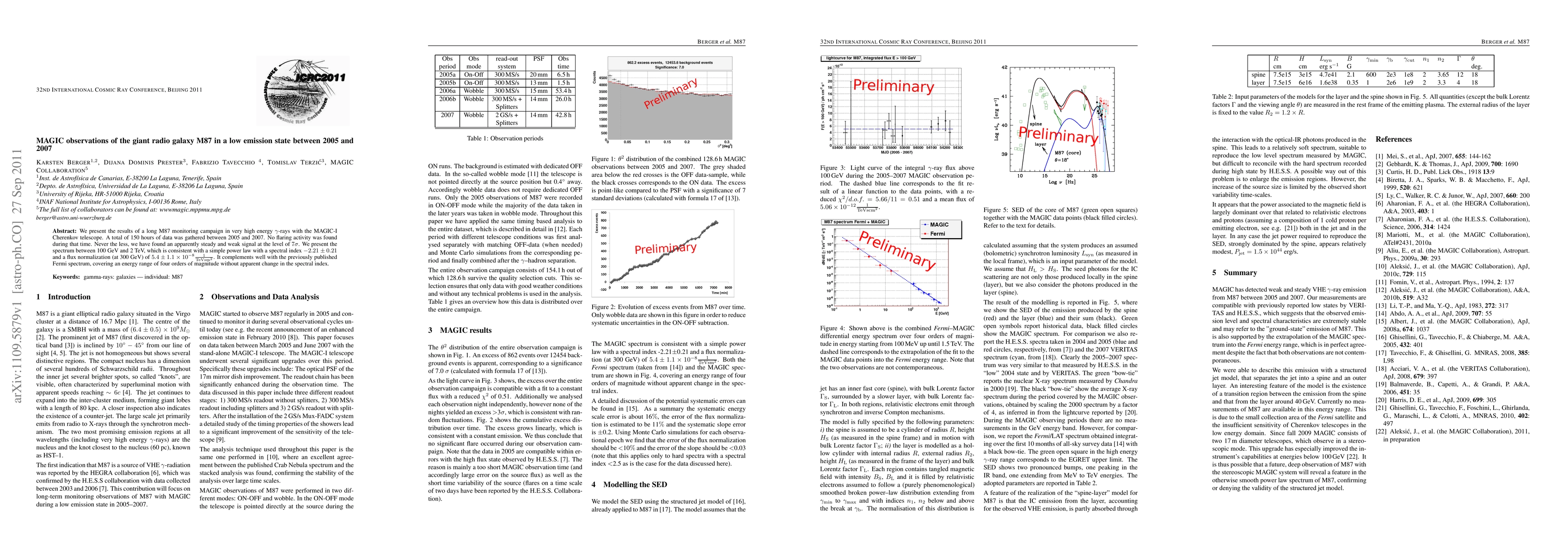 Researchers observed steady but weak gamma-ray signals from M87 between 2005 and 2007 using the MAGIC-I telescope, revealing a power-law spectrum consistent with previously published Fermi data.