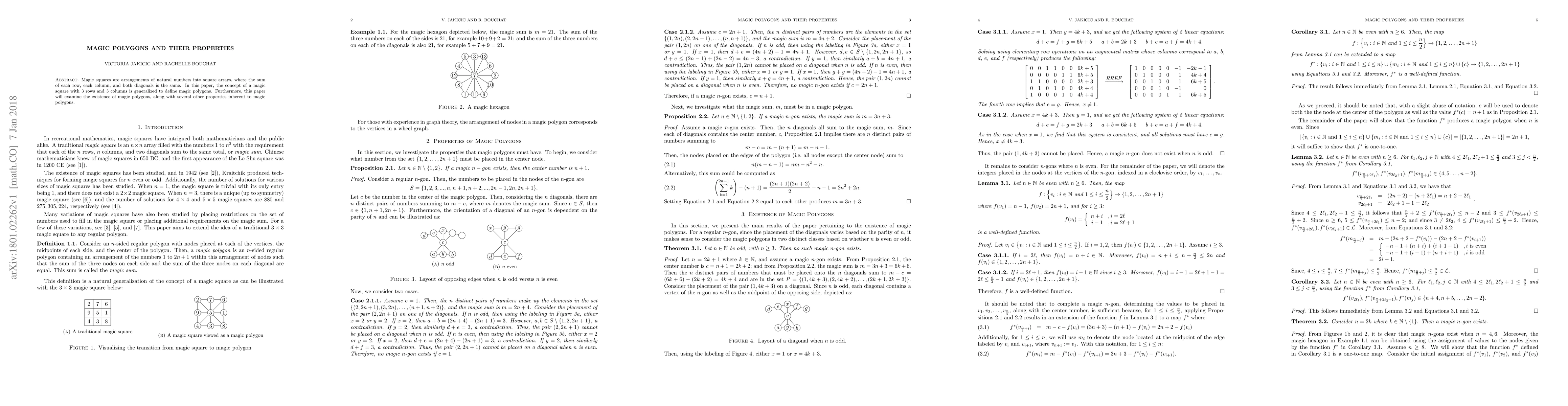 Magic squares are arrangements of natural numbers into square arrays, where the sum of each row, each column, and both diagonals is the same. In this paper, the concept of a magic square with 3 rows and 3 columns is generalized to define magic polygons. Furthermore, this paper will examine the existence of magic polygons, along with several other properties inherent to magic polygons.