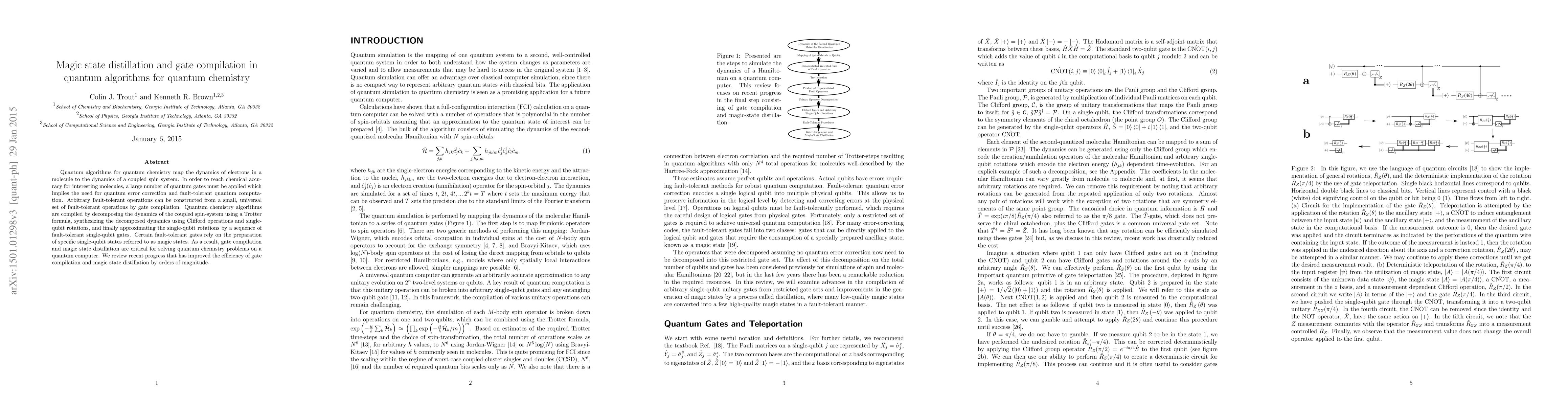 Quantum algorithms for quantum chemistry map the dynamics of electrons in a molecule to the dynamics of a coupled spin system. To reach chemical accuracy for interesting molecules, a large number of quantum gates must be applied which implies the need for quantum error correction and fault-tolerant quantum computation. Arbitrary fault-tolerant operations can be constructed from a small, universal set of fault-tolerant operations by gate compilation. Quantum chemistry algorithms are compiled by decomposing the dynamics of the coupled spin-system using a Trotter formula, synthesizing the decomposed dynamics using Clifford operations and single-qubit rotations, and finally approximating the single-qubit rotations by a sequence of fault-tolerant single-qubit gates. Certain fault-tolerant gates rely on the preparation of specific single-qubit states referred to as magic states. As a result, gate compilation and magic state distillation are critical for solving quantum chemistry problems on a quantum computer. We review recent progress that has improved the efficiency of gate compilation and magic state distillation by orders of magnitude.