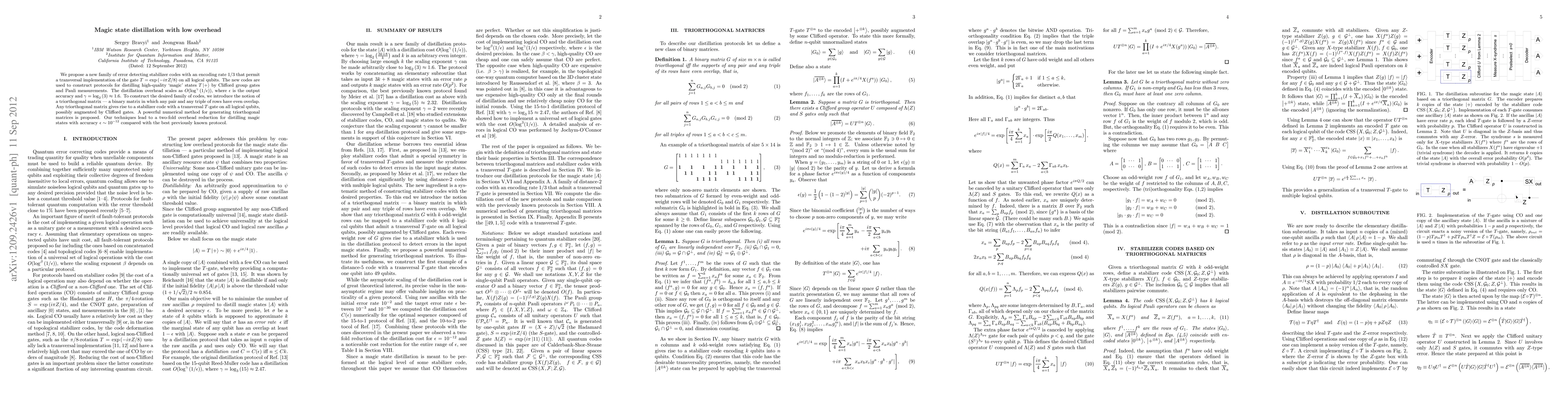 We propose a new family of error detecting stabilizer codes with an encoding rate 1/3 that permit a transversal implementation of the pi/8-rotation $T$ on all logical qubits. The new codes are used to construct protocols for distilling high-quality `magic' states $T|+>$ by Clifford group gates and Pauli measurements. The distillation overhead has a poly-logarithmic scaling as a function of the output accuracy, where the degree of the polynomial is $\log_2{3}\approx 1.6$. To construct the desired family of codes, we introduce the notion of a triorthogonal matrix --- a binary matrix in which any pair and any triple of rows have even overlap. Any triorthogonal matrix gives rise to a stabilizer code with a transversal $T$-gate on all logical qubits, possibly augmented by Clifford gates. A powerful numerical method for generating triorthogonal matrices is proposed. Our techniques lead to a two-fold overhead reduction for distilling magic states with output accuracy $10^{-12}$ compared with the best previously known protocol.