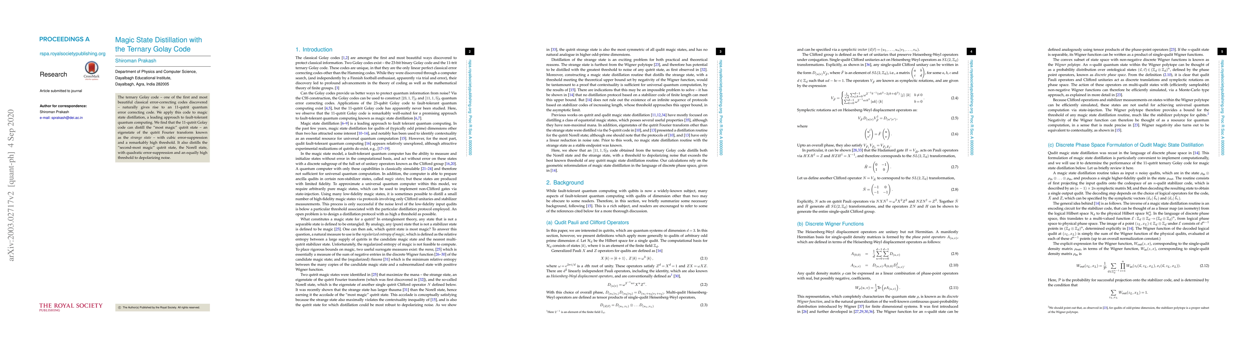 This paper explores the application of the ternary Golay code to magic state distillation in quantum computing, demonstrating that it can distill the "most magic" and "second-most magic" qutrit states with high error-suppression and threshold efficiency. The 11-qutrit Golay code shows promising results for fault-tolerant quantum computing.