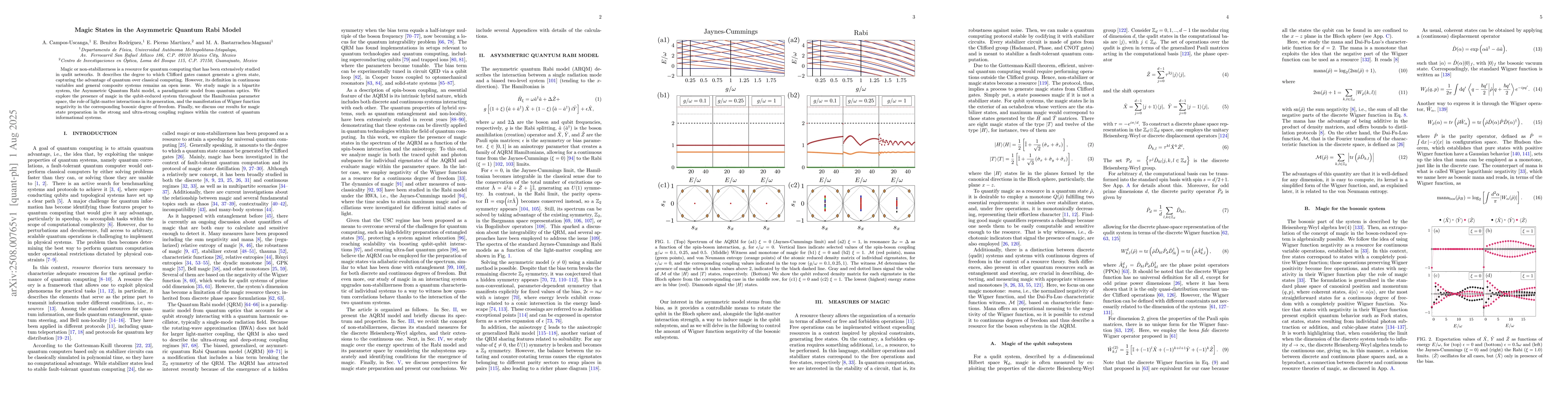 Magic or non-stabilizerness is a resource for quantum computing that has been extensively studied in qudit networks. It describes the degree to which Clifford gates cannot generate a given state, capturing the advantage of quantum over classical computing. However, its definition in continuous variables and general composite systems remains an open issue. We study magic in a bipartite system, the Asymmetric Quantum Rabi model, a paradigmatic model from quantum optics. We explore the presence of magic in the qubit-reduced system throughout the Hamiltonian parameter space, the role of light-matter interactions in its generation, and the manifestation of Wigner function negativity in the corresponding bosonic degree of freedom. Finally, we discuss our results for magic state preparation in the strong and ultra-strong coupling regimes within the context of quantum informational systems.