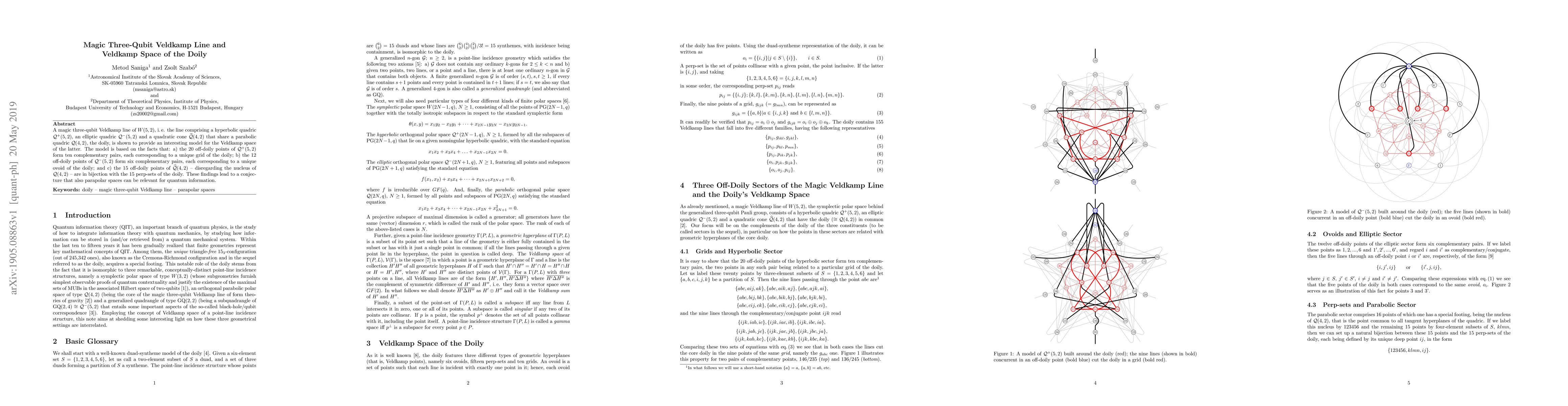 This paper explores a magic three-qubit Veldkamp line model for the Veldkamp space of a doily, showing that specific points from hyperbolic, elliptic, and quadratic cones correspond to unique features of the doily, suggesting potential relevance for quantum information. The findings propose a conjecture linking parapolar spaces to quantum information.