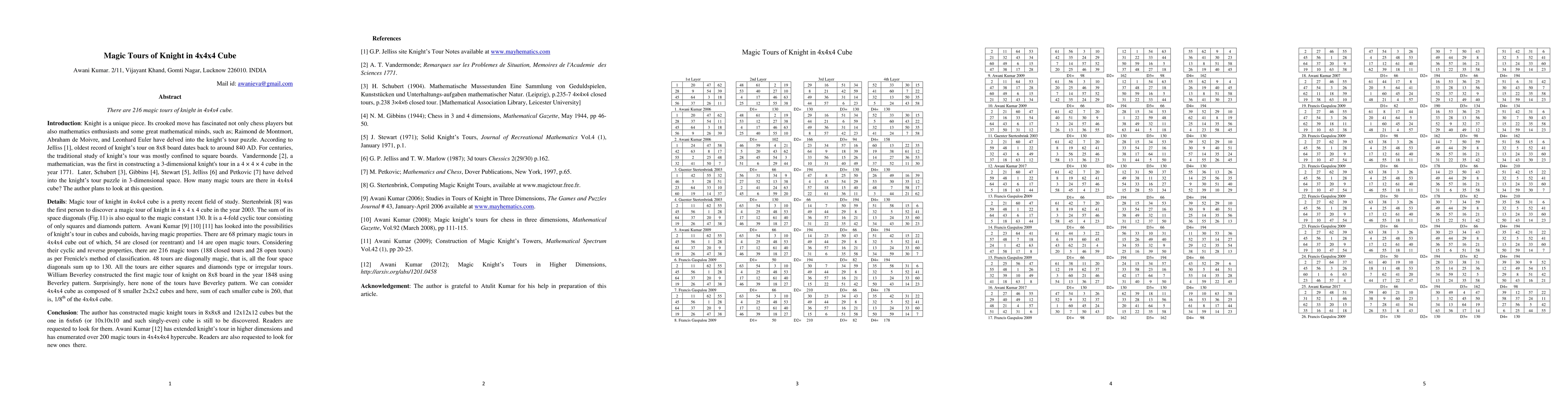 Summary: The research identifies 216 distinct magic tours achievable by a knight moving through a 4x4x4 cube, highlighting the complexity and variety of possible knight paths in this three-dimensional structure.
