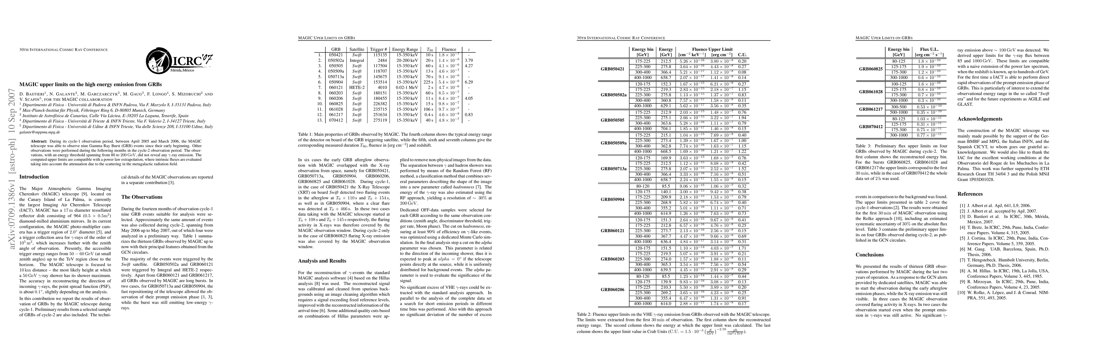 During its cycle-1 observation period, between April 2005 and March 2006, the MAGIC telescope was able to observe nine Gamma Ray Burst (GRB) events since their early beginning. Other observations were performed during the following months in the cycle-2 observation period. The observations, with an energy threshold spanning from 80 to 200 GeV, did not reveal any gamma ray emission. The computed upper limits are compatible with a power law extrapolation, where intrinsic fluxes are evaluated taking into account the attenuation due to the scattering in the metagalactic radiation field.