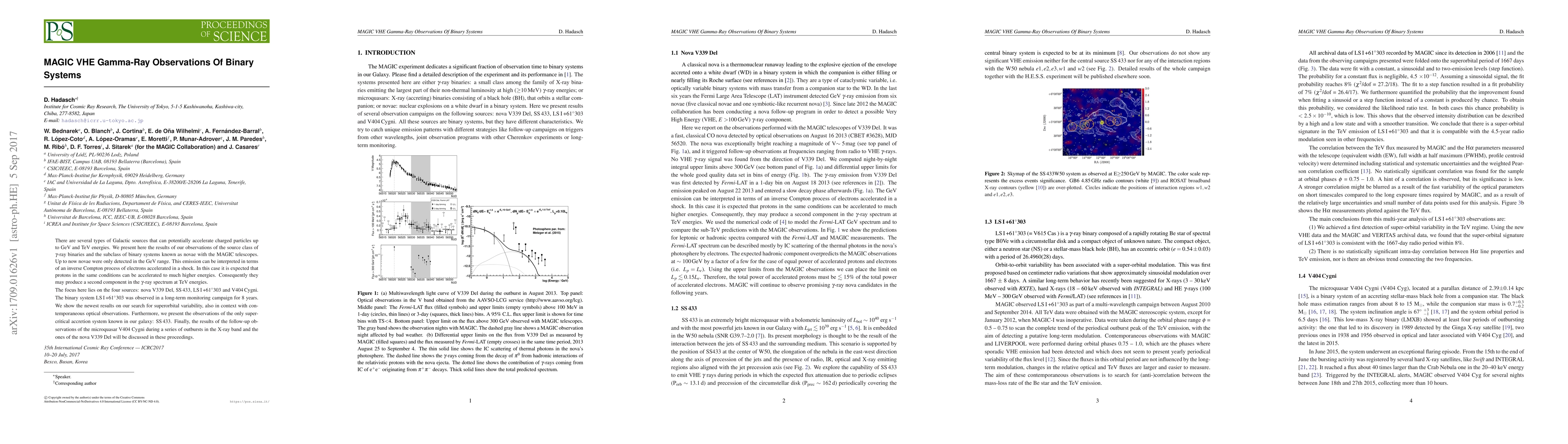 The MAGIC telescopes observed gamma-ray binaries, including novae, to detect GeV and TeV emissions, revealing potential proton acceleration to high energies. Key findings include long-term monitoring of LS I +61 303, observations of the super-critical accretion system SS433, and follow-up studies on V404 Cygni and V339 Del.
