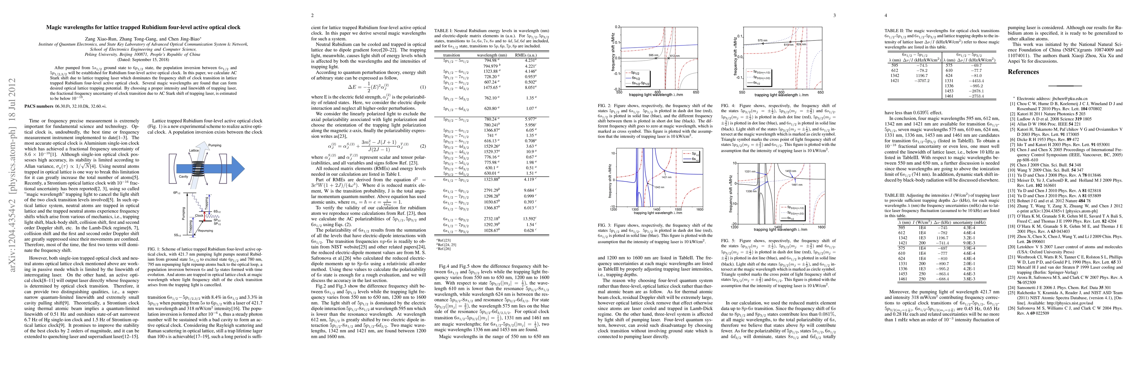 After pumped from $5s_{1/2}$ ground state to $6p_{1/2}$ state, the population inversion between $6s_{1/2}$ and $5p_{1/2,3/2}$ will be established for Rubidium four-level active optical clock. In this paper, we calculate AC Stark shift due to lattice trapping laser which dominates the frequency shift of clock transition in lattice trapped Rubidium four-level active optical clock. Several magic wavelengths are found that can form desired optical lattice trapping potential. By choosing a proper intensity and linewidth of trapping laser, the fractional frequency uncertainty of clock transition due to AC Stark shift of trapping laser, is estimated to be below 10^-18