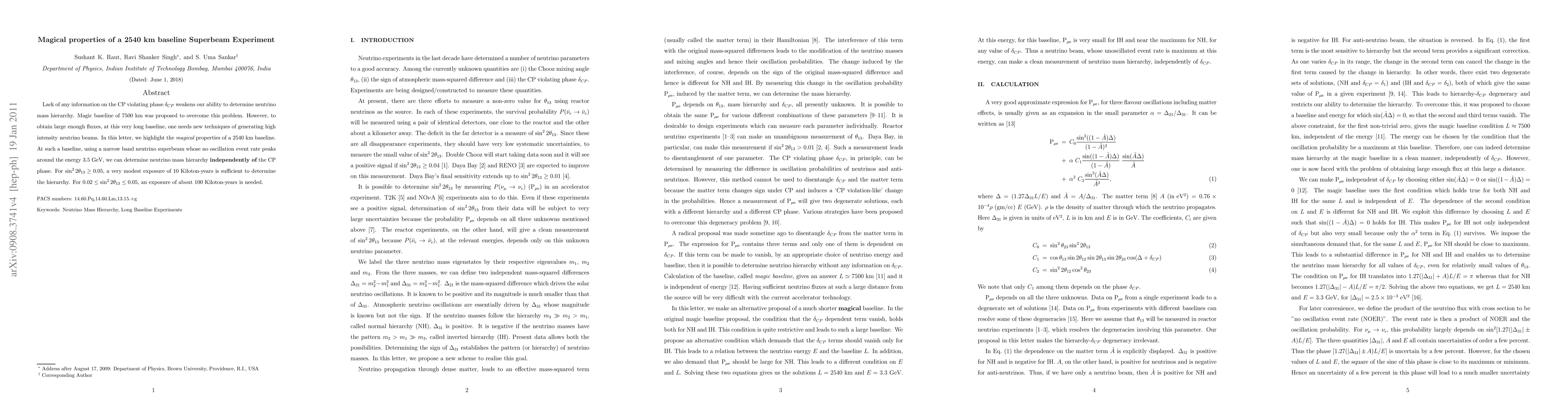 Lack of any information on the CP violating phase $\dcp$ weakens our ability to determine neutrino mass hierarchy. Magic baseline of 7500 km was proposed to overcome this problem. However, to obtain large enough fluxes, at this very long baseline, one needs new techniques of generating high intensity neutrino beams. In this letter, we highlight the {\it magical} properties of a 2540 km baseline. At such a baseline, using a narrow band neutrino superbeam whose flux peaks around the energy 3.5 GeV, we can determine neutrino mass hierarchy {\bf independent} of the CP phase. For $\sin^2 2 \theta_{13} \geq 0.05$, a very modest exposure of 10 Kiloton-years is sufficient to determine the hierarchy. For $0.02 \leq \sin^2 2 \theta_{13} \leq 0.05$, an exposure of about 100 Kiloton-years is needed.