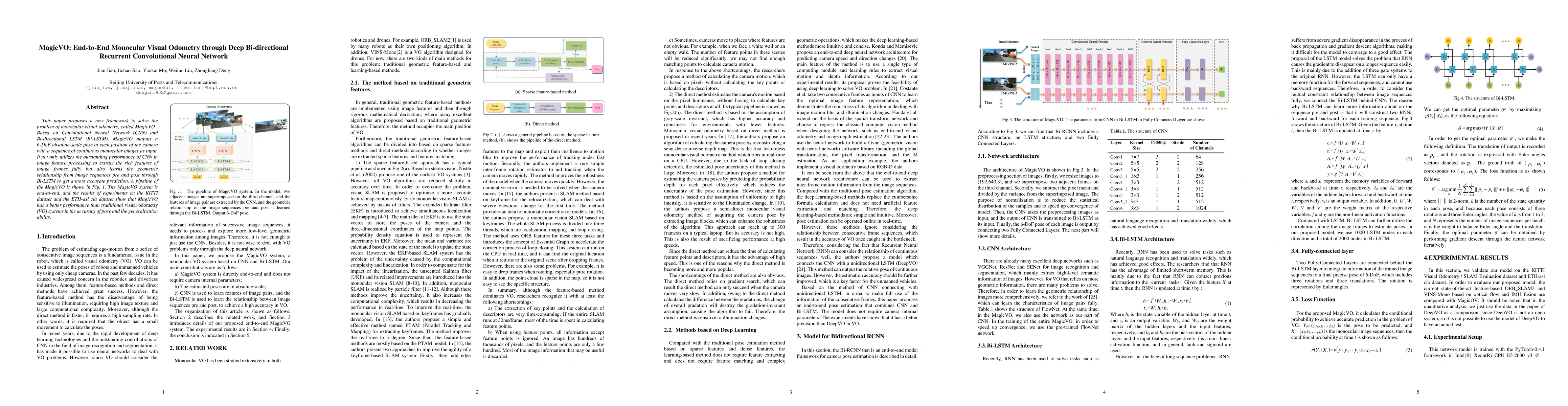 This paper proposes a new framework to solve the problem of monocular visual odometry, called MagicVO . Based on Convolutional Neural Network (CNN) and Bi-directional LSTM (Bi-LSTM), MagicVO outputs a 6-DoF absolute-scale pose at each position of the camera with a sequence of continuous monocular images as input. It not only utilizes the outstanding performance of CNN in image feature processing to extract the rich features of image frames fully but also learns the geometric relationship from image sequences pre and post through Bi-LSTM to get a more accurate prediction. A pipeline of the MagicVO is shown in Fig. 1. The MagicVO system is end-to-end, and the results of experiments on the KITTI dataset and the ETH-asl cla dataset show that MagicVO has a better performance than traditional visual odometry (VO) systems in the accuracy of pose and the generalization ability.
