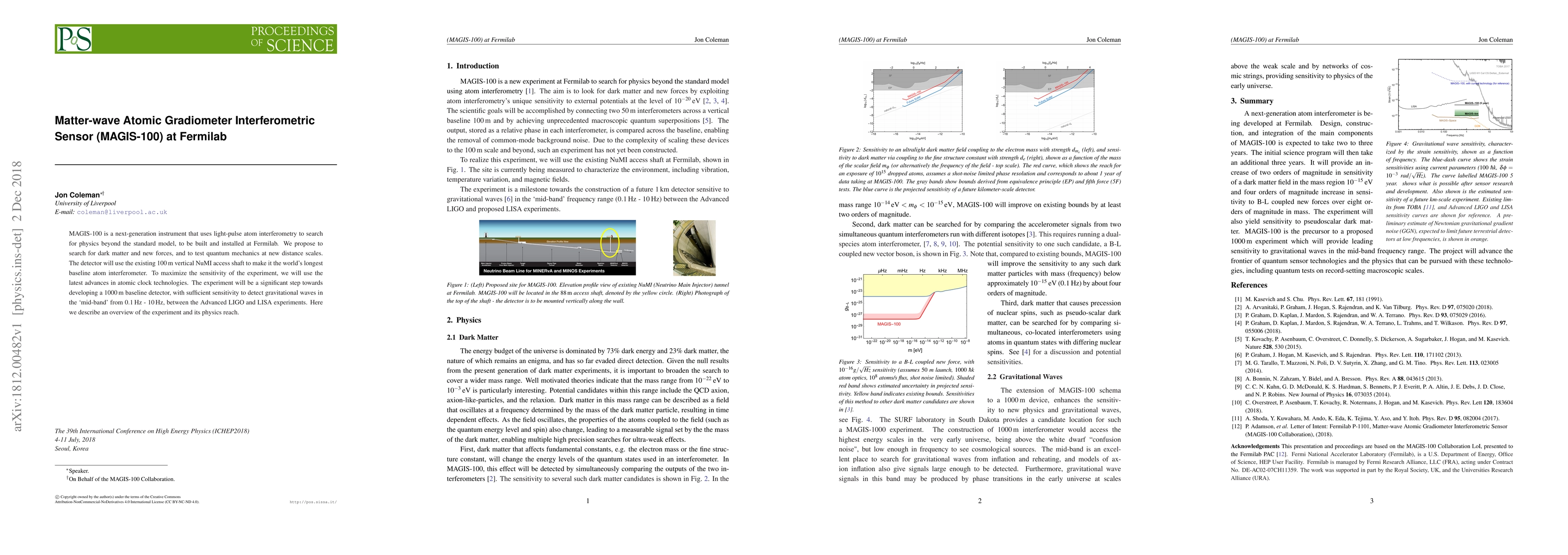 MAGIS-100 at Fermilab aims to explore physics beyond the standard model using light-pulse atom interferometry, focusing on dark matter and new forces, and testing quantum mechanics at unprecedented scales. The instrument will utilize the existing 100 m vertical NuMI access shaft to create the longest baseline atom interferometer, potentially detecting mid-band gravitational waves.