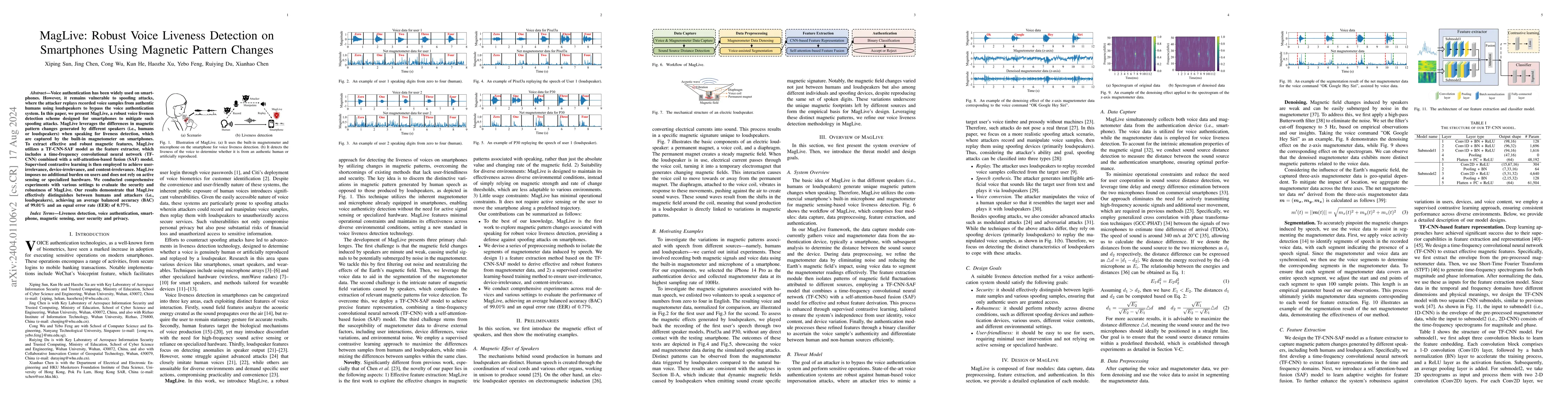 MagLive introduces a smartphone-based voice liveness detection system that uses near-field magnetic sensing to distinguish between live human voices and replayed recordings, achieving 99.01% accuracy. It leverages CNNs and self-attention fusion, along with supervised contrastive learning for robustness.