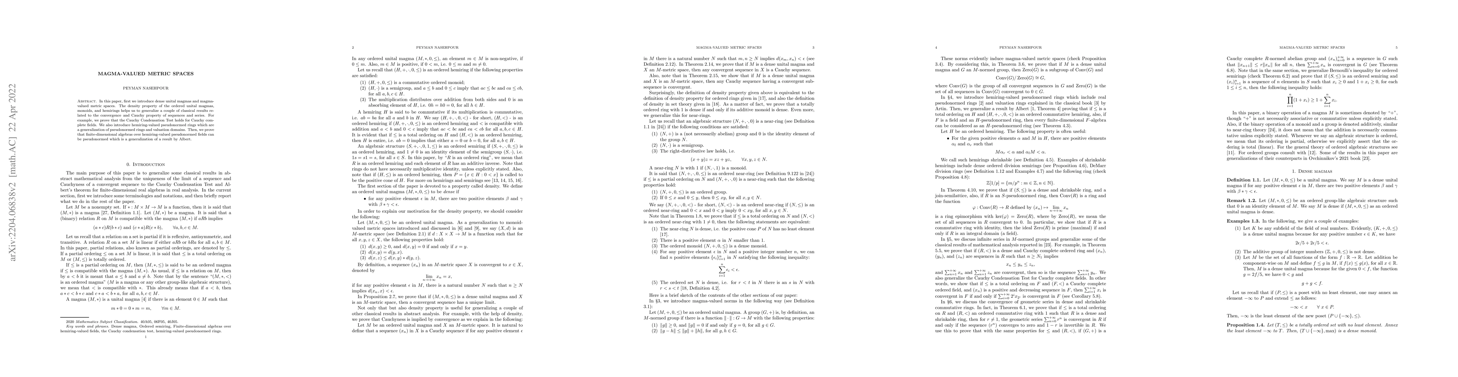 This paper introduces magma-valued metric spaces and dense unital magmas, extending classical convergence and Cauchy properties using these structures. It also generalizes pseudonormed rings and proves that finite-dimensional algebras over hemiring-valued pseudonormed fields can be pseudonormed, extending a result by Albert.