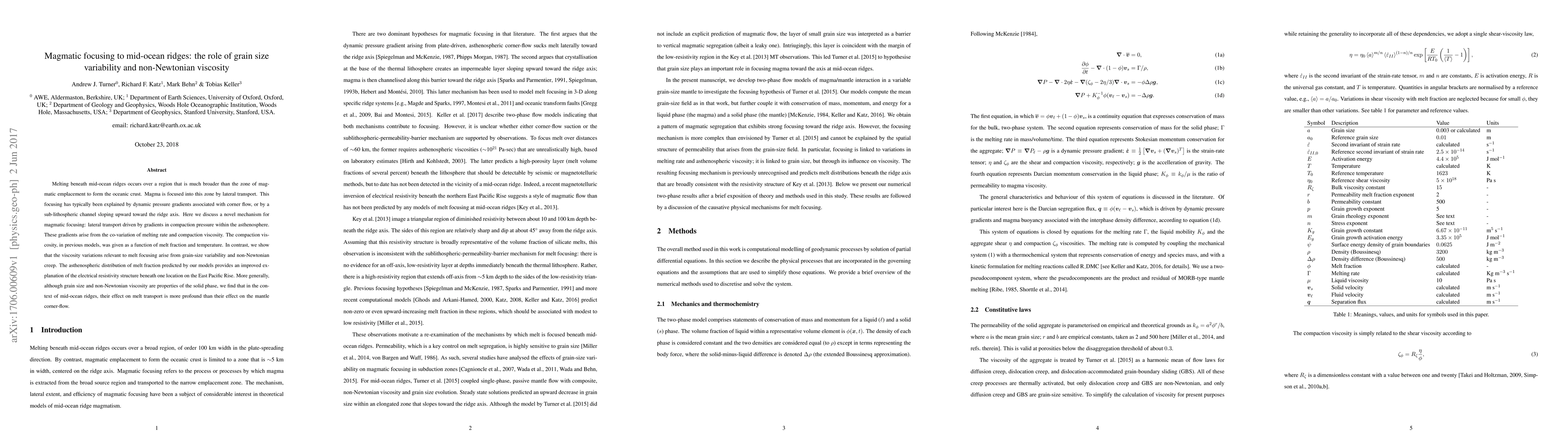 This paper proposes a novel mechanism for magmatic focusing beneath mid-ocean ridges, driven by compaction pressure gradients due to grain-size variability and non-Newtonian viscosity, rather than traditional dynamic pressure gradients. The models suggest that this approach better explains observed electrical resistivity structures.