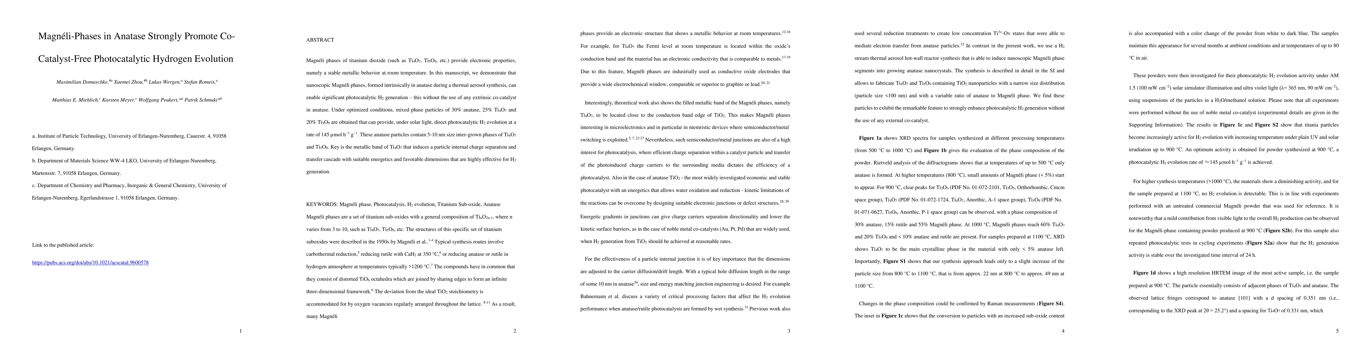 Research demonstrates that Magneli phases in anatase titanium dioxide enable significant photocatalytic hydrogen evolution without co-catalysts. Mixed-phase anatase particles with intrinsic Magneli phases achieve a solar-light-driven H2 evolution rate of 145 micromol h-1 g-1 due to effective internal charge separation induced by the metallic band of Ti4O7.