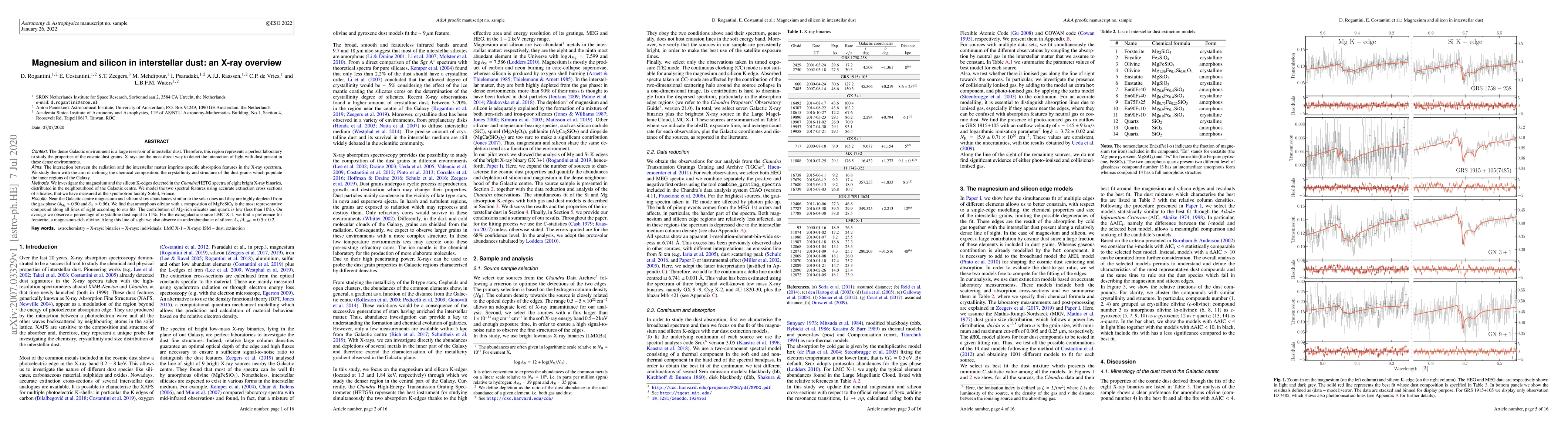 The dense Galactic environment is a large reservoir of interstellar dust. Therefore, this region represents a perfect laboratory to study the properties of the cosmic dust grains. X-rays are the most direct way to detect the interaction of light with dust present in these dense environments. The interaction between the radiation and the interstellar matter imprints specific absorption features in the X-ray spectrum. We study them with the aim of defining the chemical composition, the crystallinity and structure of the dust grains which populate the inner regions of the Galaxy. We investigate the magnesium and the silicon K-edges detected in the Chandra/HETG spectra of eight bright X-ray binaries, distributed in the neighbourhood of the Galactic centre. We model the two spectral features using accurate extinction cross sections of silicates, that we have measured at the synchrotron facility Soleil, France. Near the Galactic centre magnesium and silicon show abundances similar to the solar ones and they are highly depleted from the gas phase ($\delta_{\rm{Mg}}>0.90$ and $\delta_{\rm{Si}}>0.96$). We find that amorphous olivine with a composition of $\rm MgFeSiO_{4}$ is the most representative compound along all lines of sight according to our fits. The contribution of Mg-rich silicates and quartz is low (less than $10\%$). On average we observe a percentage of crystalline dust equal to $11\%$. For the extragalactic source LMC X-1, we find a preference for forsterite, a magnesium-rich olivine. Along this line of sight we also observe an underabundance of silicon $A_{\rm Si}/A_{\rm LMC} = 0.5\pm0.2$.