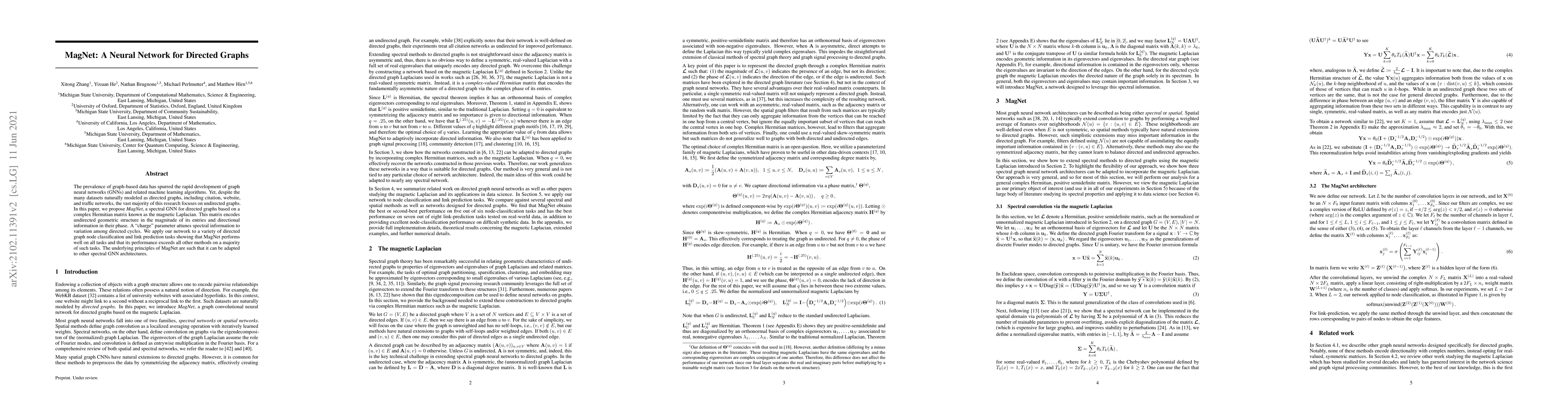 MagNet is a spectral graph neural network for directed graphs that leverages a magnetic Laplacian matrix to encode both undirected geometry and directional information. It outperforms other methods in directed graph node classification and link prediction tasks.