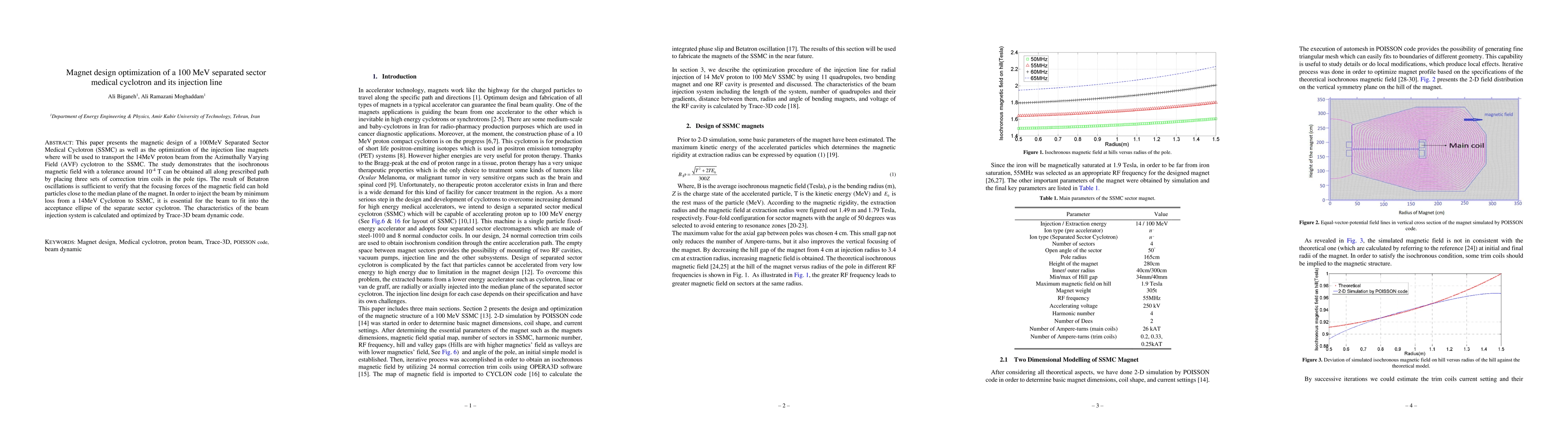 This paper presents the magnetic design of a 100MeV Separated Sector Medical Cyclotron (SSMC) as well as the optimization of the injection line magnets where will be used to transport the 14MeV proton beam from the Azimuthally Varying Field (AVF) cyclotron to the SSMC. The study demonstrates that the isochronous magnetic field with a tolerance around 10-4 T can be obtained all along prescribed path by placing three sets of correction trim coils in the pole tips. The result of Betatron oscillations is sufficient to verify that the focusing forces of the magnetic field can hold particles close to the median plane of the magnet. In order to inject the beam by minimum loss from a 14MeV Cyclotron to SSMC, it is essential for the beam to fit into the acceptance ellipse of the separate sector cyclotron. The characteristics of the beam injection system is calculated and optimized by Trace-3D beam dynamic code.