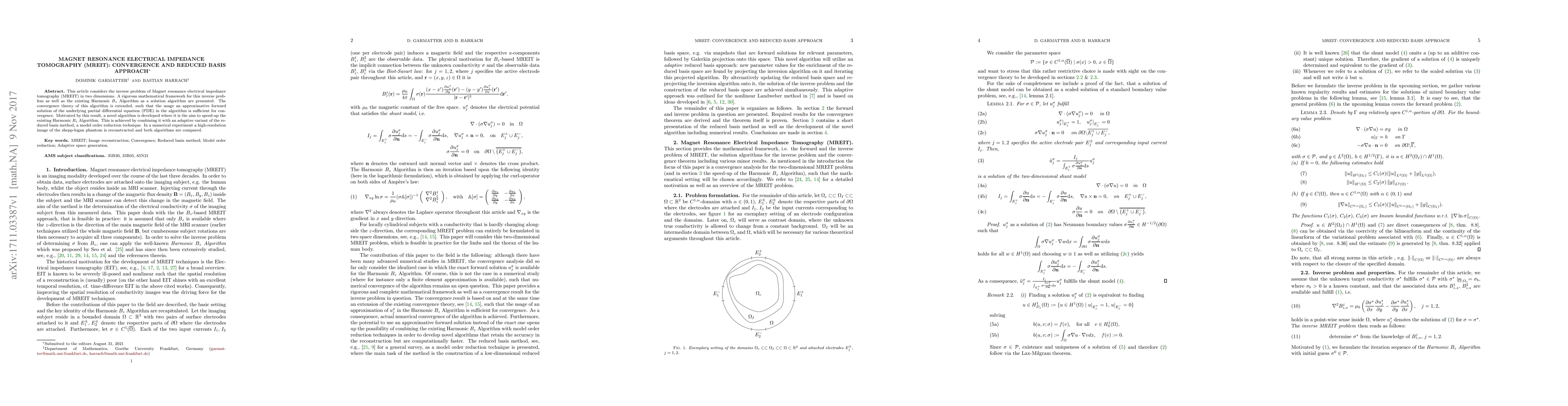 This article considers the inverse problem of Magnet resonance electrical impedance tomography (MREIT) in two dimensions. A rigorous mathematical framework for this inverse problem as well as the existing Harmonic $B_z$ Algorithm as a solution algorithm are presented. The convergence theory of this algorithm is extended, such that the usage an approximative forward solution of the underlying partial differential equation (PDE) in the algorithm is sufficient for convergence. Motivated by this result, a novel algorithm is developed where it is the aim to speed-up the existing Harmonic $B_z$ Algorithm. This is achieved by combining it with an adaptive variant of the reduced basis method, a model order reduction technique. In a numerical experiment a high-resolution image of the shepp-logan phantom is reconstructed and both algorithms are compared.