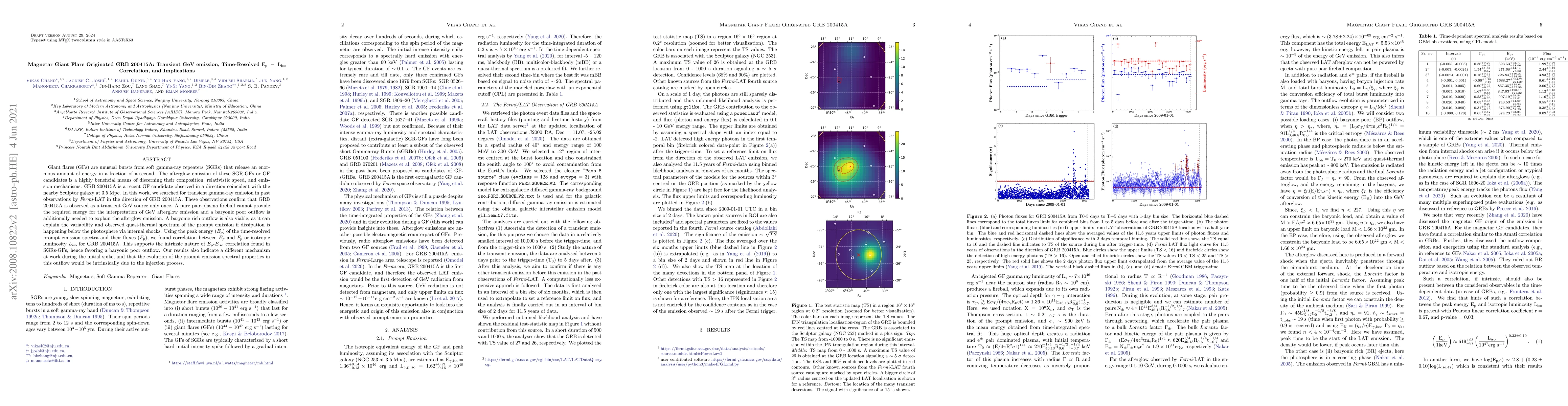 The research identifies GRB 200415A as a giant magnetar flare, confirming its transient GeV emission observed by Fermi-LAT. It suggests a baryonic poor outflow to explain the afterglow, supported by a time-resolved $E_p$-$L_{iso}$ correlation. This implies a distinct mechanism during the initial spike, with spectral evolution driven by the injection process.