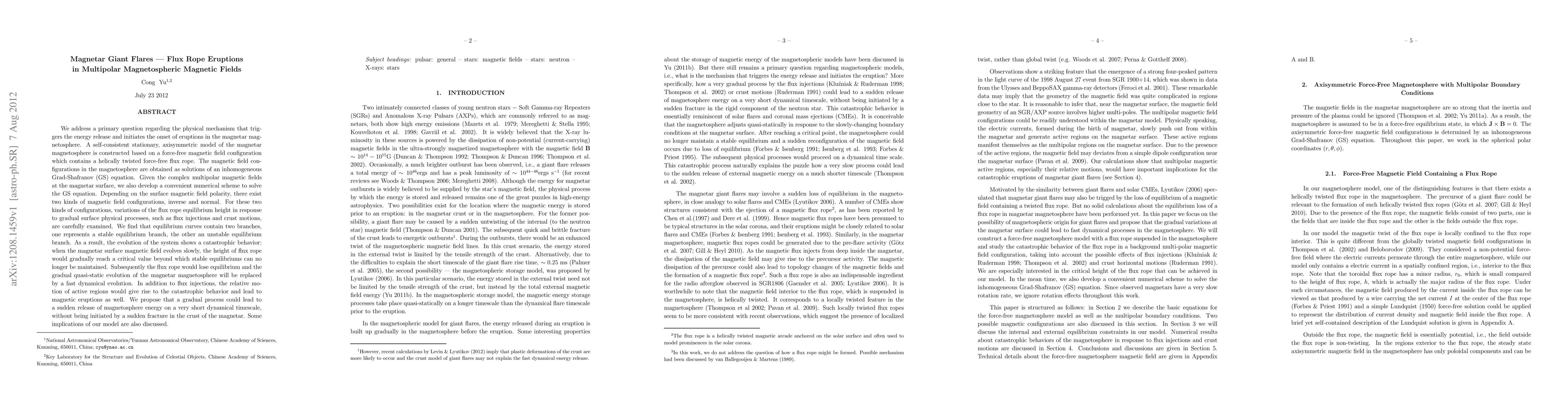 This paper investigates the mechanism behind magnetar giant flares, proposing that gradual surface processes like flux injections and crust motions can trigger catastrophic flux rope eruptions in the magnetar's multipolar magnetosphere. The study finds that the system's evolution can lead to a sudden release of energy without requiring a sudden crust fracture.