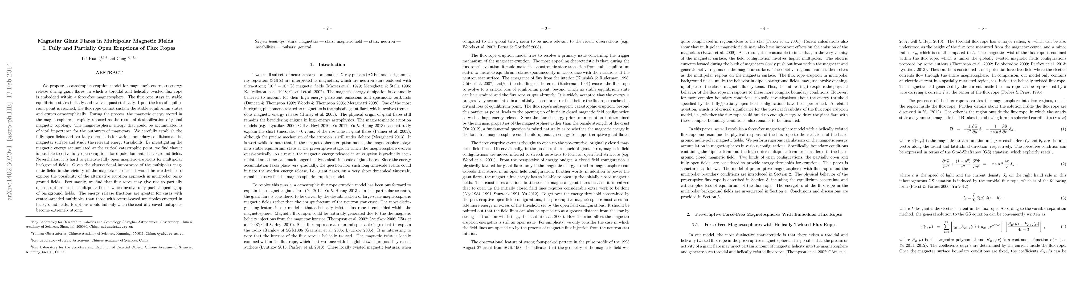 This paper proposes a model for magnetar giant flares, suggesting that flux ropes embedded in a force-free magnetosphere can erupt catastrophically, releasing stored magnetic energy. It finds that fully open eruptions are feasible in dipole-dominated fields but difficult in multipolar fields, though partially open eruptions are possible in the latter, with higher energy release fractions for central-arcaded multipoles.