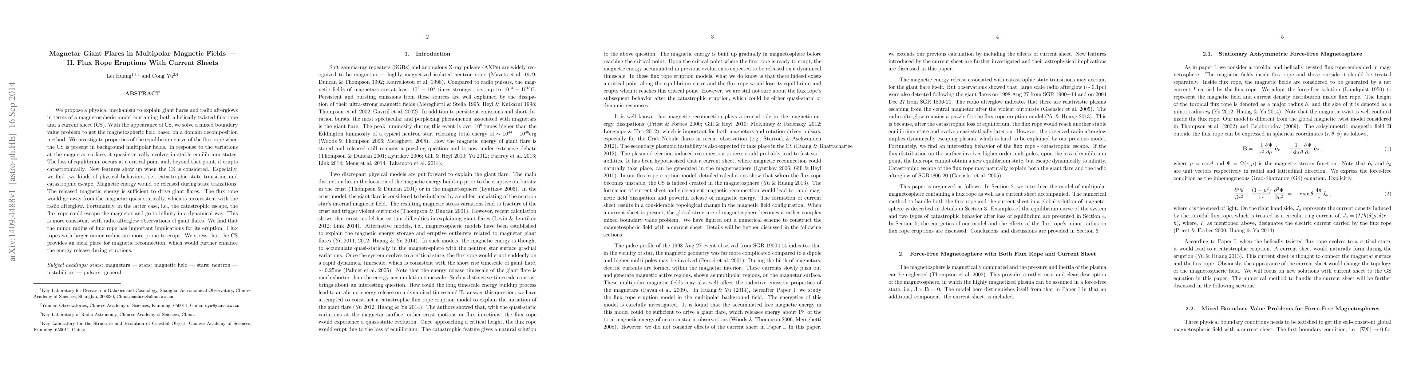 We propose a physical mechanism to explain giant flares and radio afterglows in terms of a magnetospheric model containing both a helically twisted flux rope and a current sheet (CS). With the appearance of CS, we solve a mixed boundary value problem to get the magnetospheric field based on a domain decomposition method. We investigate properties of the equilibrium curve of the flux rope when the CS is present in background multipolar fields. In response to the variations at the magnetar surface, it quasi-statically evolves in stable equilibrium states. The loss of equilibrium occurs at a critical point and, beyond that point, it erupts catastrophically. New features show up when the CS is considered. Especially, we find two kinds of physical behaviors, i.e., catastrophic state transition and catastrophic escape. Magnetic energy would be released during state transitions. The released magnetic energy is sufficient to drive giant flares. The flux rope would go away from the magnetar quasi-statically, which is inconsistent with the radio afterglow. Fortunately, in the latter case, i.e., the catastrophic escape, the flux rope could escape the magnetar and go to infinity in a dynamical way. This is more consistent with radio afterglow observations of giant flares. We find that the minor radius of flux rope has important implications for its eruption. Flux ropes with larger minor radius are more prone to erupt. We stress that the CS provides an ideal place for magnetic reconnection, which would further enhance the energy release during eruptions.