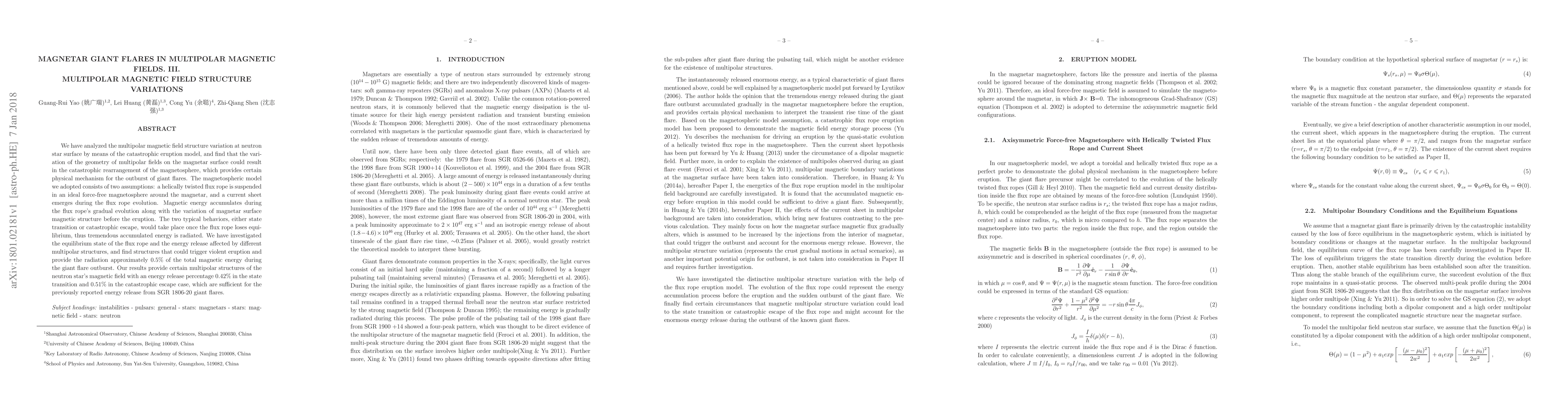 We have analyzed the multipolar magnetic field structure variation at neutron star surface by means of the catastrophic eruption model, and find that the variation of the geometry of multipolar fields on the magnetar surface could result in the catastrophic rearrangement of the magnetosphere, which provides certain physical mechanism for the outburst of giant flares. The magnetospheric model we adopted consists of two assumptions: a helically twisted flux rope is suspended in an ideal force-free magnetosphere around the magnetar, and a current sheet emerges during the flux rope evolution. Magnetic energy accumulates during the flux rope's gradual evolution along with the variation of magnetar surface magnetic structure before the eruption. The two typical behaviors, either state transition or catastrophic escape, would take place once the flux rope loses equilibrium, thus tremendous accumulated energy is radiated. We have investigated the equilibrium state of the flux rope and the energy release affected by different multipolar structures, and find structures that could trigger violent eruption and provide the radiation approximately 0.5$\%$ of the total magnetic energy during the giant flare outburst. Our results provide certain multipolar structures of the neutron star's magnetic field with an energy release percentage 0.42$\%$ in the state transition and 0.51$\%$ in the catastrophic escape case, which are sufficient for the previously reported energy release from SGR 1806-20 giant flares.