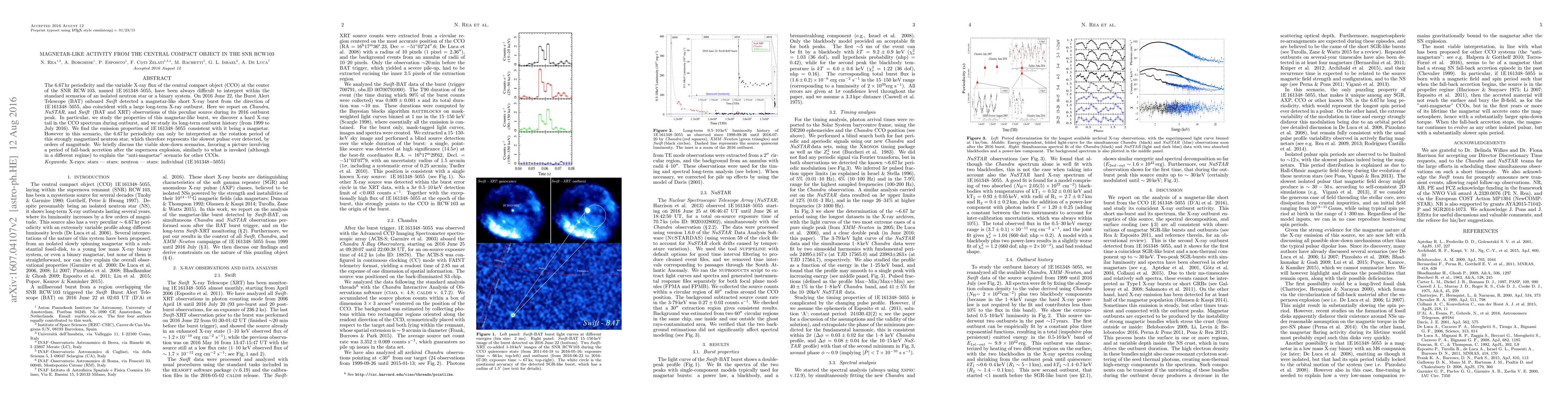 The 6.67 hr periodicity and the variable X-ray flux of the central compact object (CCO) at the center of the SNR RCW 103, named 1E 161348-5055, have been always difficult to interpret within the standard scenarios of an isolated neutron star or a binary system. On 2016 June 22, the Burst Alert Telescope (BAT) onboard Swift detected a magnetar-like short X-ray burst from the direction of 1E 161348-5055, also coincident with a large long-term X-ray outburst. Here we report on Chandra, NuSTAR, and Swift (BAT and XRT) observations of this peculiar source during its 2016 outburst peak. In particular, we study the properties of this magnetar-like burst, we discover a hard X-ray tail in the CCO spectrum during outburst, and we study its long-term outburst history (from 1999 to July 2016). We find the emission properties of 1E 161348-5055 consistent with it being a magnetar. However in this scenario, the 6.67 hr periodicity can only be interpreted as the rotation period of this strongly magnetized neutron star, which therefore represents the slowest pulsar ever detected, by orders of magnitude. We briefly discuss the viable slow-down scenarios, favoring a picture involving a period of fall-back accretion after the supernova explosion, similarly to what is invoked (although in a different regime) to explain the "anti-magnetar" scenario for other CCOs.
