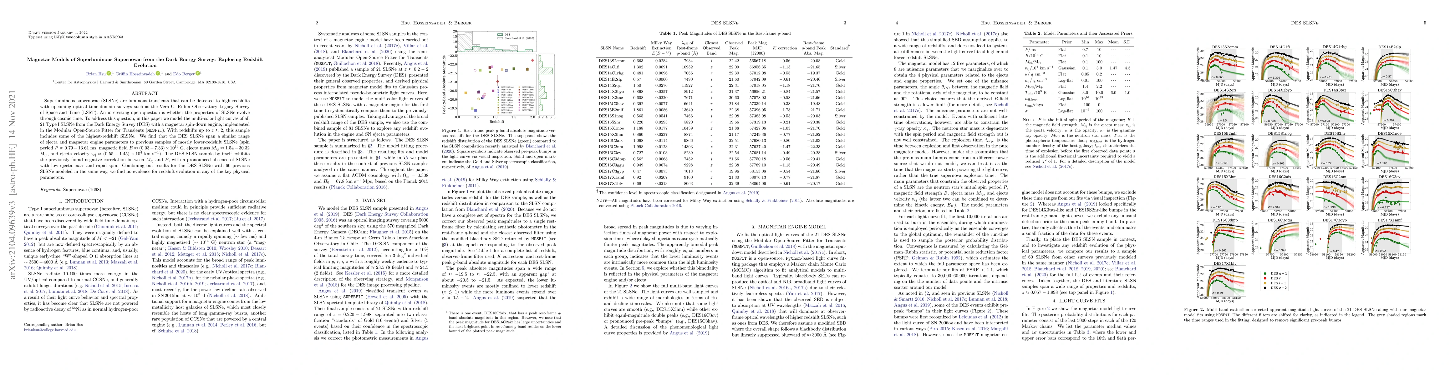 Superluminous supernovae (SLSNe) are luminous transients that can be detected to high redshifts with upcoming optical time-domain surveys such as the Vera C. Rubin Observatory Legacy Survey of Space and Time (LSST). An interesting open question is whether the properties of SLSNe evolve through cosmic time. To address this question, in this paper we model the multi-color light curves of all 21 Type I SLSNe from the Dark Energy Survey (DES) with a magnetar spin-down engine, implemented in the Modular Open Source Fitter for Transients (MOSFiT). With redshifts up to $z\approx 2$, this sample includes some of the highest-redshift SLSNe. We find that the DES SLSNe span a similar range of ejecta and magnetar engine parameters to previous samples of mostly lower-redshift SLSNe (spin period $P\approx 0.79-13.61$ ms, magnetic field $B\approx (0.03-7.33)\times10^{14}$ G, ejecta mass $M_{\rm ej}\approx 1.54-30.32$ M$_{\odot}$, and ejecta velocity $v_{\rm ej}\approx (0.55-1.45)\times 10^4$ km s$^{-1}$). The DES SLSN sample by itself exhibits the previously found negative correlation between $M_{\rm ej}$ and $P$, with a pronounced absence of SLSNe with low ejecta mass and rapid spin. Combining our results for the DES SLSNe with 60 previous SLSNe modeled in the same way, we find no evidence for redshift evolution in any of the key physical parameters.