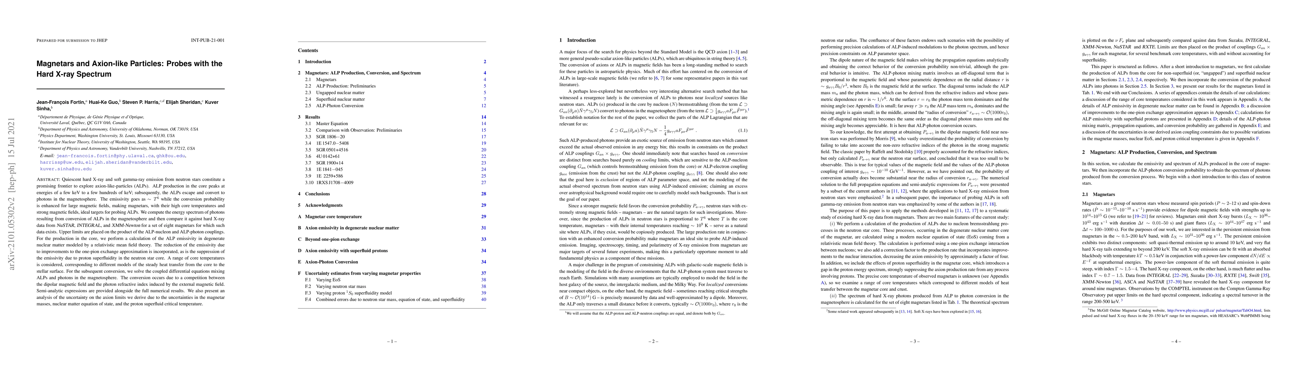 Quiescent hard X-ray and soft gamma-ray emission from neutron stars constitute a promising frontier to explore axion-like-particles (ALPs). ALP production in the core peaks at energies of a few keV to a few hundreds of keV; subsequently, the ALPs escape and convert to photons in the magnetosphere. The emissivity goes as $\sim T^6$ while the conversion probability is enhanced for large magnetic fields, making magnetars, with their high core temperatures and strong magnetic fields, ideal targets for probing ALPs. We compute the energy spectrum of photons resulting from conversion of ALPs in the magnetosphere and then compare it against hard X-ray data from NuSTAR, INTEGRAL, and XMM-Newton, for a set of eight magnetars for which such data exists. Upper limits are placed on the product of the ALP-nucleon and ALP-photon couplings. For the production in the core, we perform a calculation of the ALP emissivity in degenerate nuclear matter modeled by a relativistic mean field theory. The reduction of the emissivity due to improvements to the one-pion exchange approximation is incorporated, as is the suppression of the emissivity due to proton superfluidity in the neutron star core. A range of core temperatures is considered, corresponding to different models of the steady heat transfer from the core to the stellar surface. For the subsequent conversion, we solve the coupled differential equations mixing ALPs and photons in the magnetosphere. The conversion occurs due to a competition between the dipolar magnetic field and the photon refractive index induced by the external magnetic field. Semi-analytic expressions are provided alongside the full numerical results. We also present an analysis of the uncertainty on the axion limits we derive due to the uncertainties in the magnetar masses, nuclear matter equation of state, and the proton superfluid critical temperature.