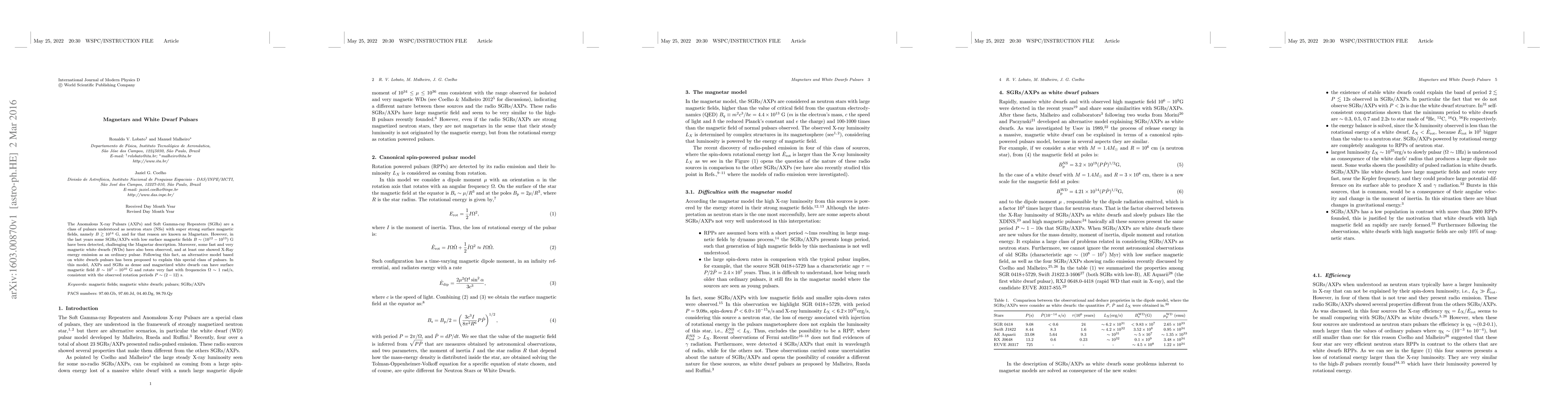 This paper discusses the classification of Anomalous X-ray Pulsars (AXPs) and Soft Gamma-ray Repeaters (SGRs) traditionally as magnetars, yet recent detections of low-field SGRs/AXPs challenge this view. An alternative model proposes that these pulsars could be fast and highly magnetized white dwarfs with magnetic fields in the range $10^{7}-10^{10}$ G and rotation periods of 2-12 seconds.