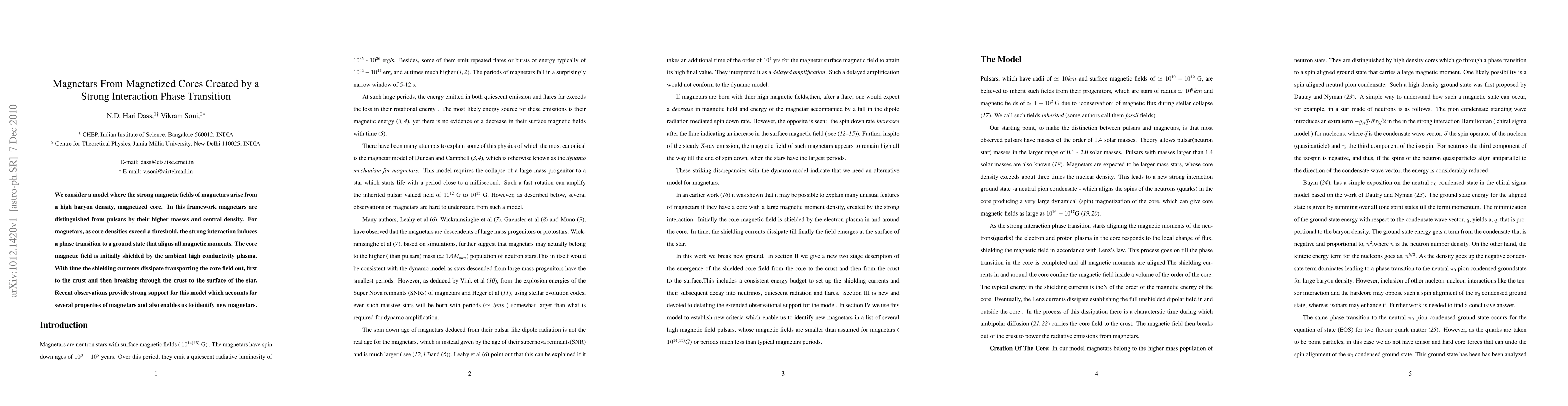 This paper proposes a model where magnetars' strong magnetic fields originate from a high-density, magnetized core undergoing a phase transition due to strong interaction, leading to a neutral pion condensate. Observations support this model, distinguishing magnetars from pulsars by their higher mass and density, and enabling identification of new magnetars.