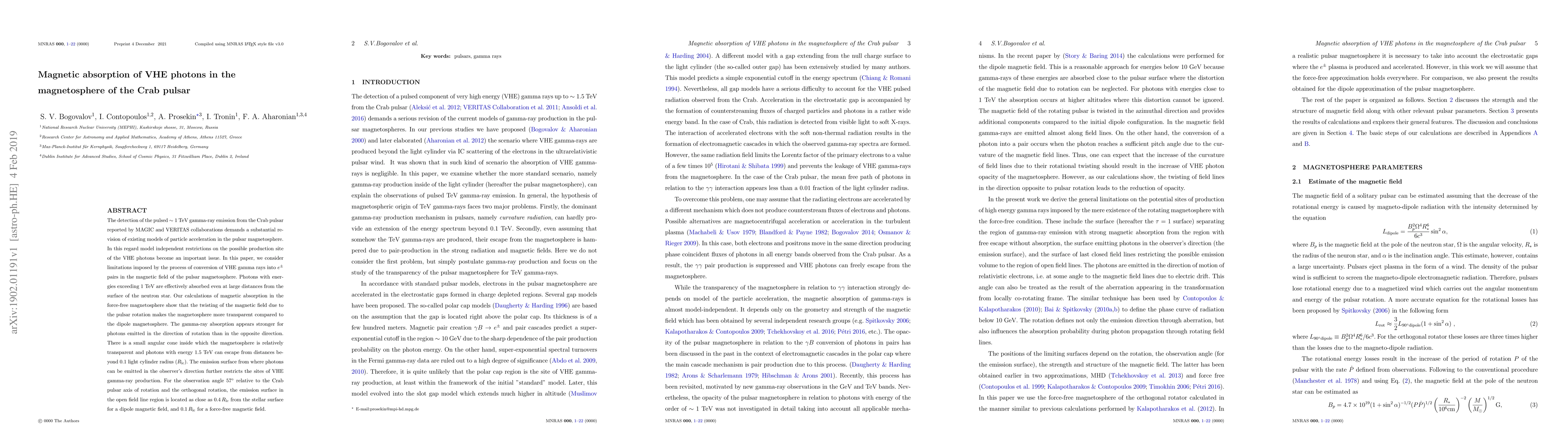 This paper investigates the magnetic absorption of very high energy (VHE) gamma rays in the Crab pulsar's magnetosphere, revealing that VHE photons exceeding 1 TeV are absorbed even at large distances from the neutron star. The twisting magnetic field due to pulsar rotation makes the magnetosphere more transparent, allowing photons with energy up to 1.5 TeV to escape from beyond 0.1 light cylinder radius.