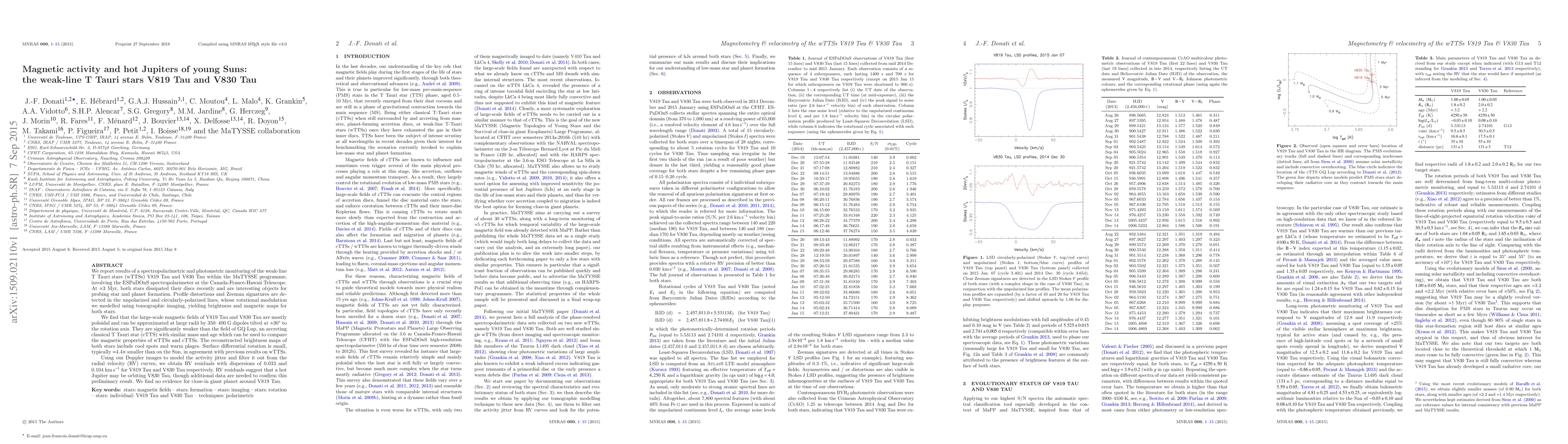 The study uses spectropolarimetric and photometric monitoring of young stars V819 Tau and V830 Tau, revealing their magnetic fields and surface features. Both stars, at ~3 million years old, have mostly poloidal magnetic fields weaker than those of accreting T Tauri stars. Modeling activity jitter, the researchers found potential evidence for a hot Jupiter orbiting V830 Tau, but no planets around V819 Tau.