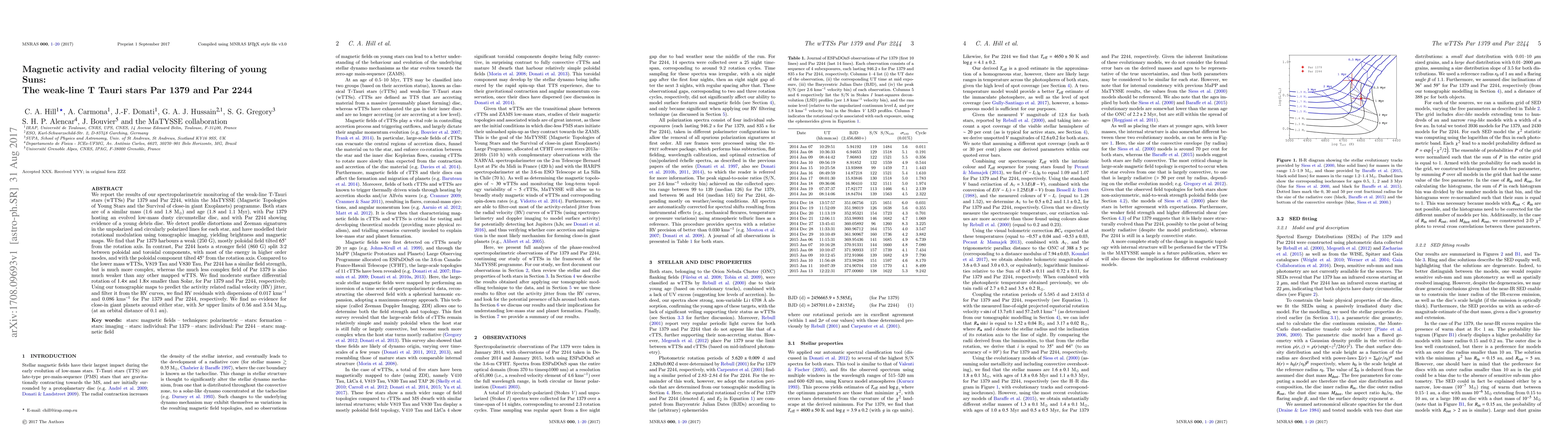 This study, part of the MaTYSSE program, monitored weak-line T Tauri stars Par 1379 and Par 2244. It found that Par 1379 has a weak, poloidal magnetic field tilted 65° from its rotation axis, while Par 2244 has a stronger, complex field split between poloidal and toroidal components, tilted 45°. Both show moderate surface differential rotation. By filtering activity-related radial velocity jitter, the study found no evidence of close-in giant planets around either star.