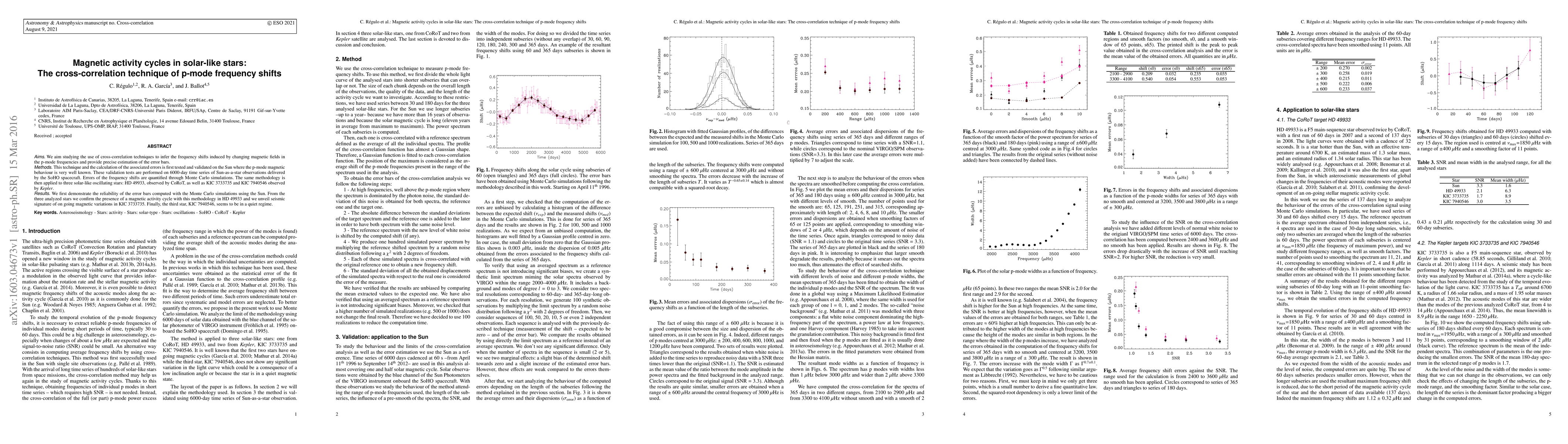 This paper explores the use of cross-correlation techniques to detect magnetic activity cycles in solar-like stars by analyzing p-mode frequency shifts, validated on the Sun and applied to three stars, revealing magnetic cycles in HD 49933 and ongoing magnetic variations in KIC 3733735.