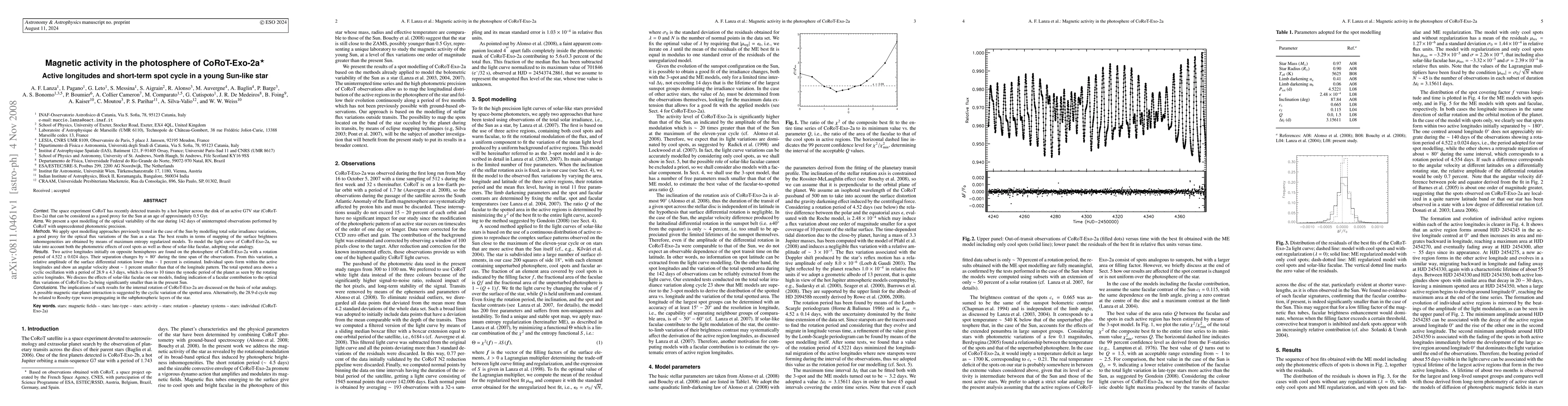 The CoRoT space experiment detected transits of a hot Jupiter across the active G7V star CoRoT-Exo-2a, which serves as a young Sun proxy. Through spot modeling of 142 days of high-precision observations, two active longitudes on the star's photosphere were identified, showing a rotation period of 4.522 days and a cyclic oscillation of the spotted area with a 28.9-day period, suggesting potential magnetic star-planet interactions or Rossby waves.