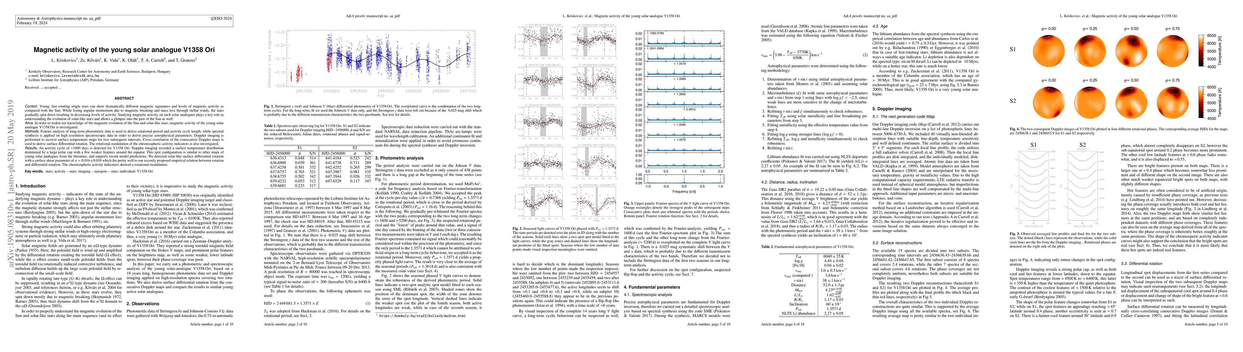 This study investigates the magnetic activity of the young solar analogue V1358 Ori, revealing an activity cycle of approximately 1600 days and a surface differential rotation consistent with solar-like stars. Doppler imaging shows a temperature distribution with a large polar cap, supporting model predictions.