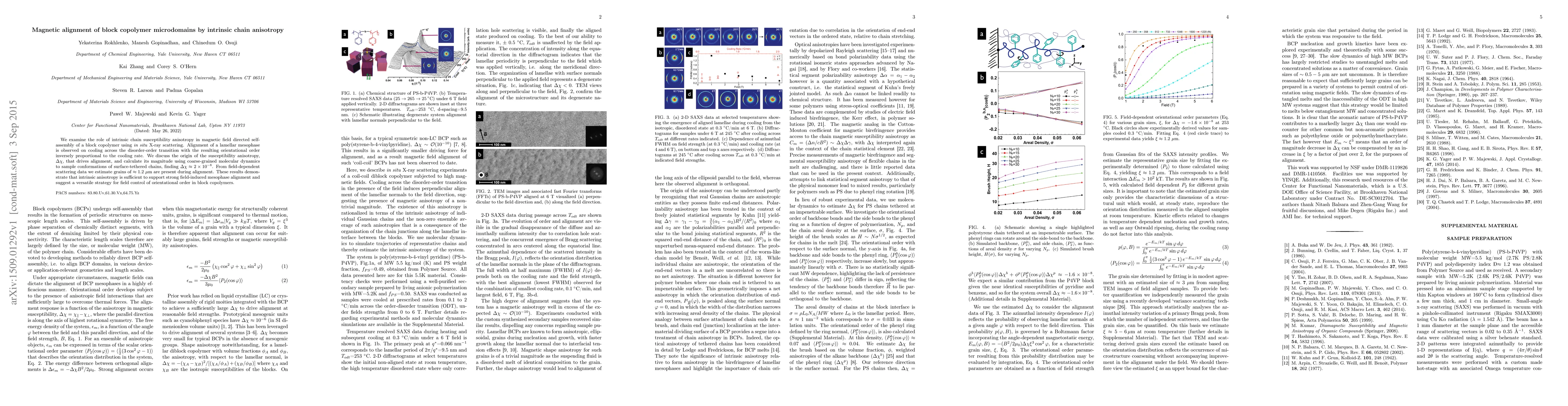 This study investigates the magnetic field-induced self-assembly of block copolymers, revealing that intrinsic chain anisotropy drives the alignment of lamellar mesophases. The research finds that the alignment's orientational order is inversely proportional to the cooling rate, with a susceptibility anisotropy magnitude of $\Delta\chi\approx 2\times10^{-8}$, and suggests a versatile method for controlling the orientational order in block copolymers.