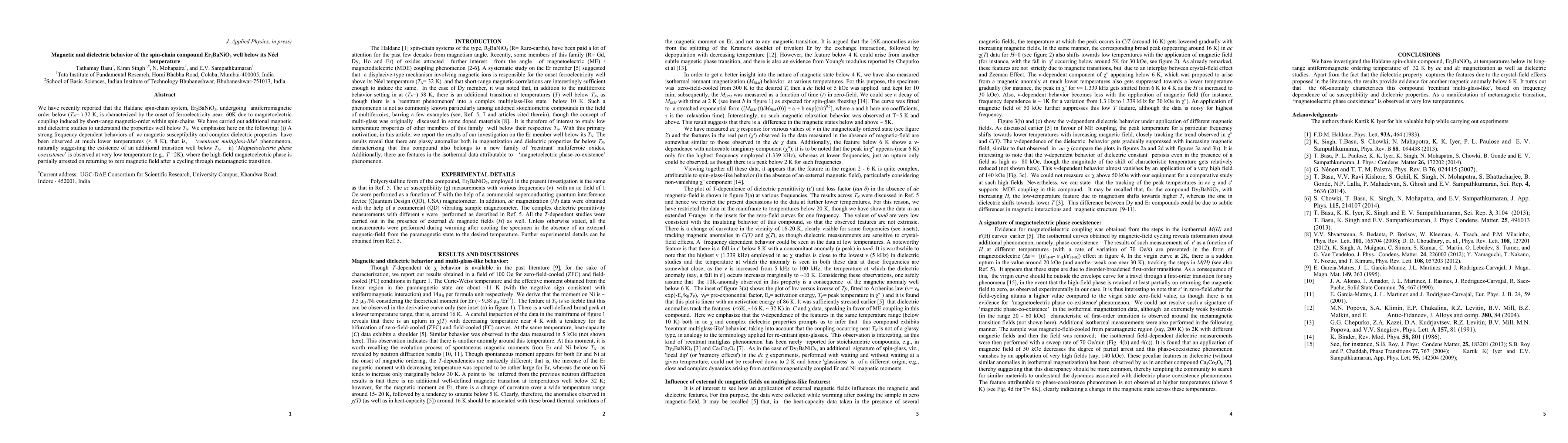 We have recently reported that the Haldane spin-chain system, Er2BaNiO5, undergoing antiferromagnetic order below 32 K, is characterized by the onset of ferroelectricity near 60K due to magnetoelectric coupling induced by short-range magnetic-order within spin-chains. We have carried out additional magnetic and dielectric studies to understand the properties well below antiferromagnetic ordering temperature. We emphasize here on the following: (i) A strong frequency dependent behaviors of ac magnetic susceptibility and complex dielectric properties have been observed at much lower temperatures (below 8 K), that is, reentrant multiglass-like phenomenon, naturally suggesting the existence of an additional transition well below Neel temperature; ii) Magnetoelectric phase coexistence is observed at very low temperature (e.g., T =2K), where the high-field magnetoelectric phase is partially arrested on returning to zero magnetic field after a cycling through metamagnetic transition.
