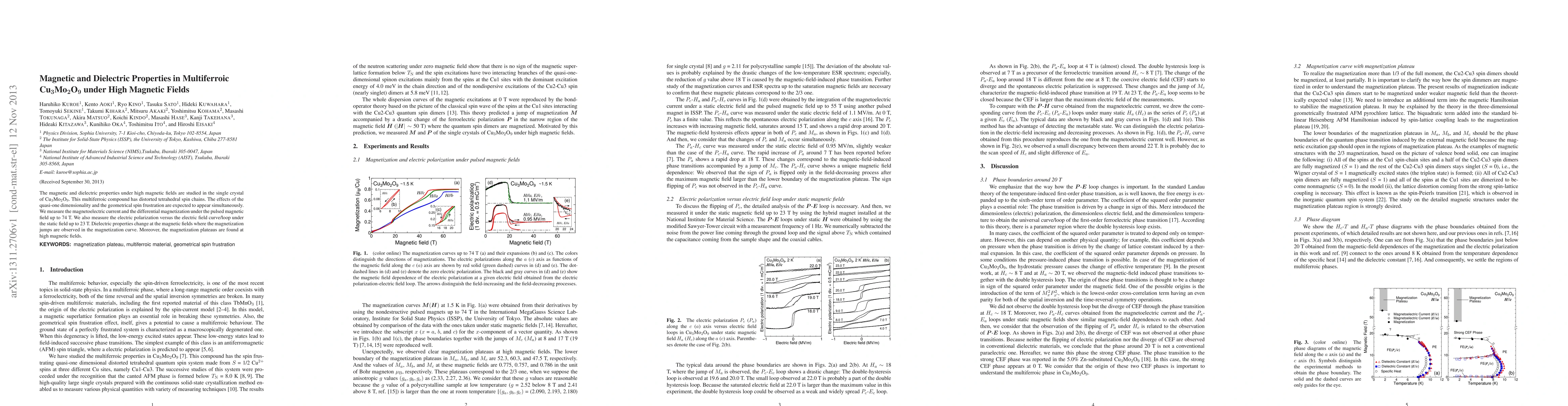 This study investigates the magnetic and dielectric properties of the multiferroic compound Cu3Mo2O9 under high magnetic fields, revealing changes in dielectric properties coinciding with magnetization jumps and identifying magnetization plateaus at high fields. Magnetoelectric current and differential magnetization measurements were conducted up to 74 T, alongside electric polarization measurements under static fields up to 23 T.
