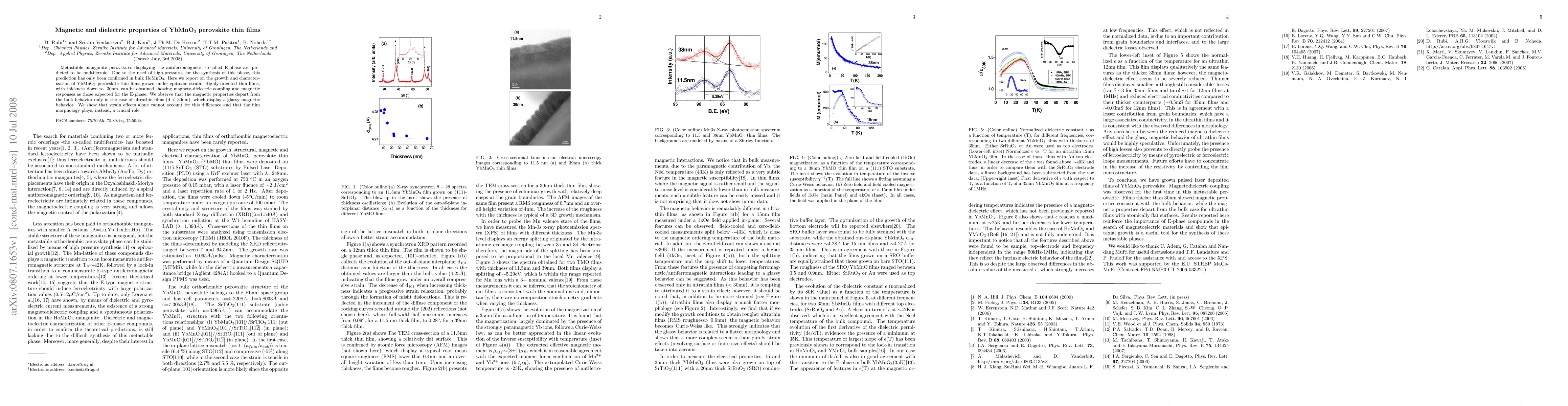 This study investigates YbMnO3 perovskite thin films, revealing magneto-dielectric coupling and E-phase magnetic behavior. Ultrathin films (<30nm) exhibit glassy magnetism, suggesting that film morphology, rather than strain, influences magnetic properties.